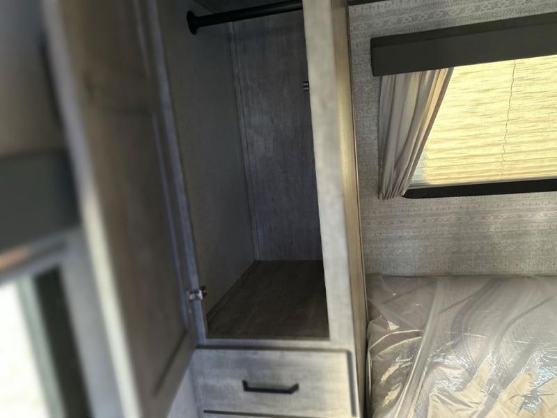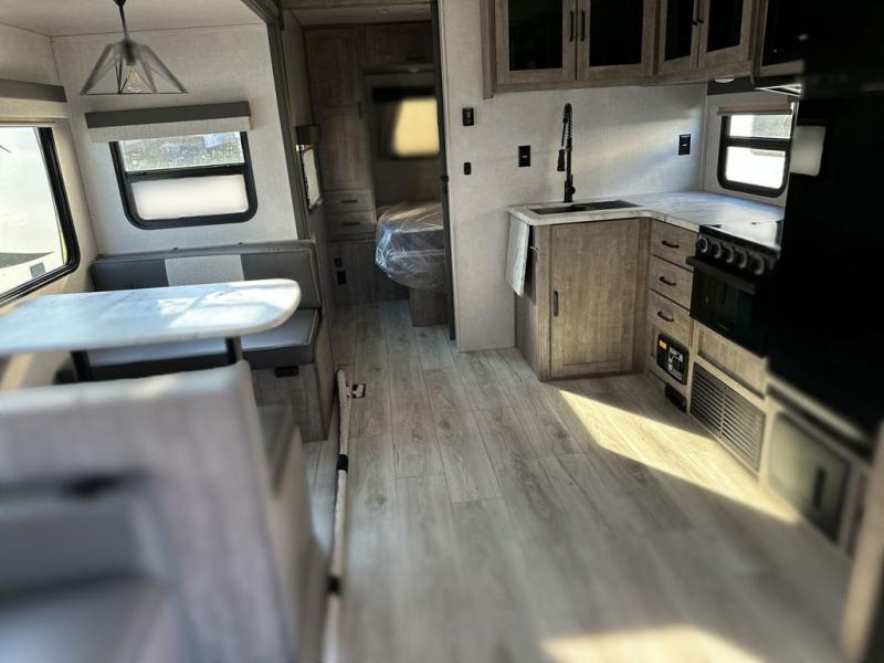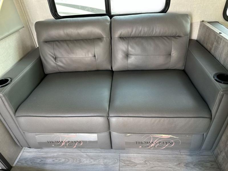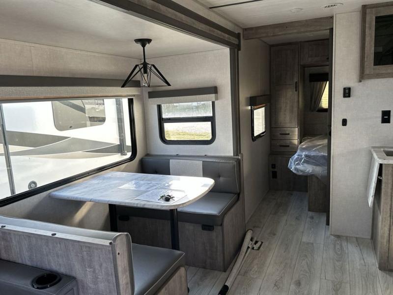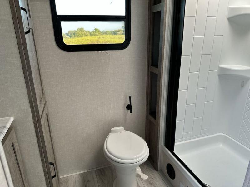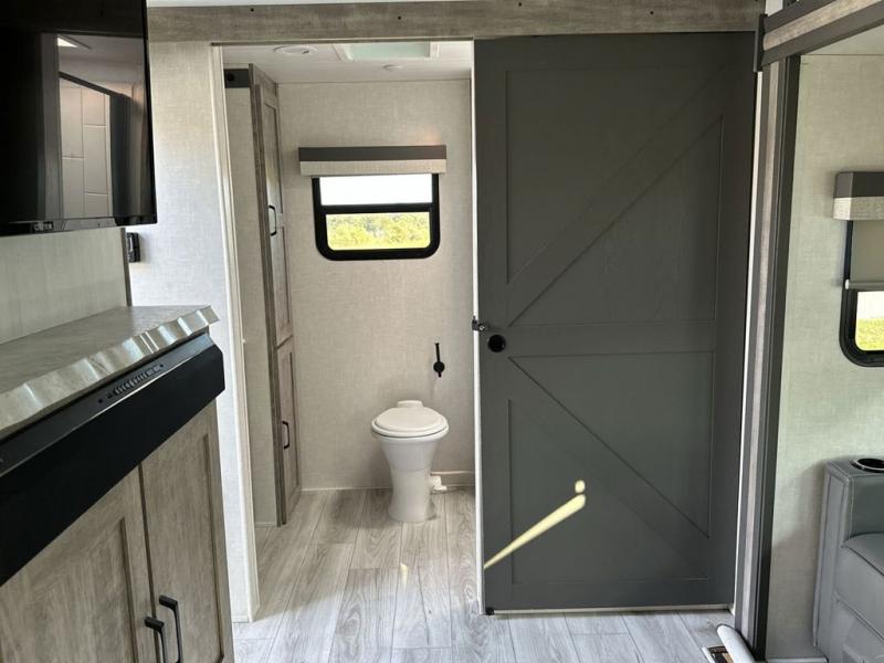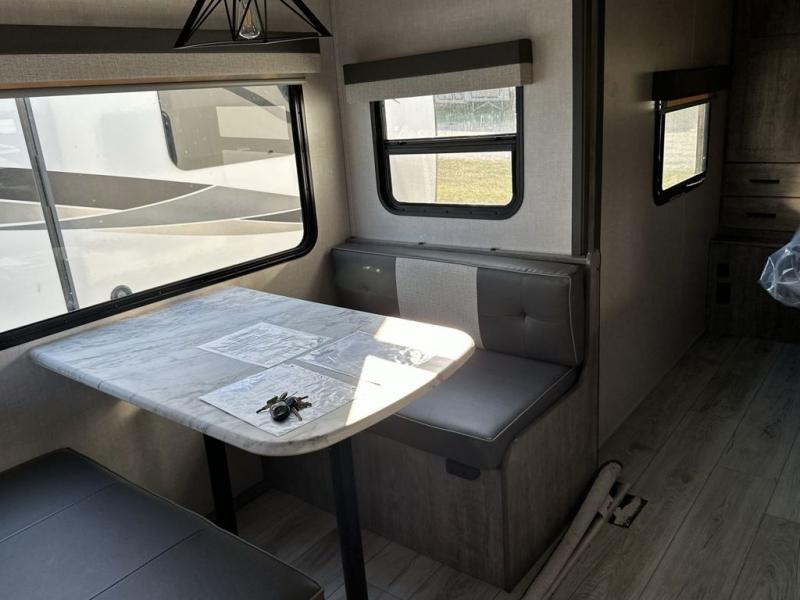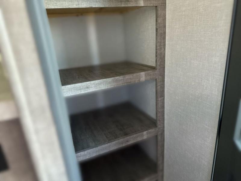 No need to rough it when you camp; this trailer offers amenities that allow you to "Glamp" if you want! The rear spacious bathroom is tucked away behind a beautiful barn door, and inside features a 30" x 36" shower, wardrobe, and linen storage. The front master bedroom offers privacy, a walk-around queen bed, two wardrobes, "Cubbie" storage at the head of the bed, USB ports for your electronics, and massive under bed storage for extra blankets and pillows. The L-shaped counter in the kitchen provides enough space to have everything at your fingertips while you cook, plus there is a countertop extension for more prep and serving space if needed. A nice walk-in pantry just inside the entry door will be perfect for chips and snacks or canned goods for those longer camping trips. If dining inside, the booth dinette with EZ-Access storage beneath will be comfortable plus you will enjoy the view provided by the panoramic windows within the slide out. An outside kitchen will be a favorite for anyone that cooks, and the 19' awning will provide some protection from the elements and offering an outdoor living area to enjoy with everyone.