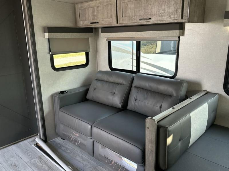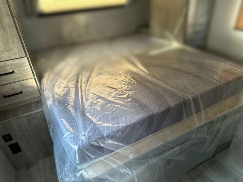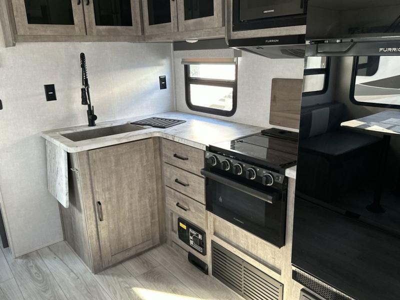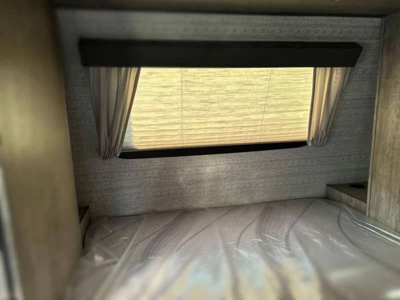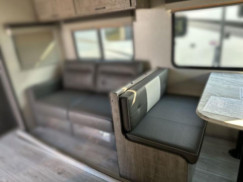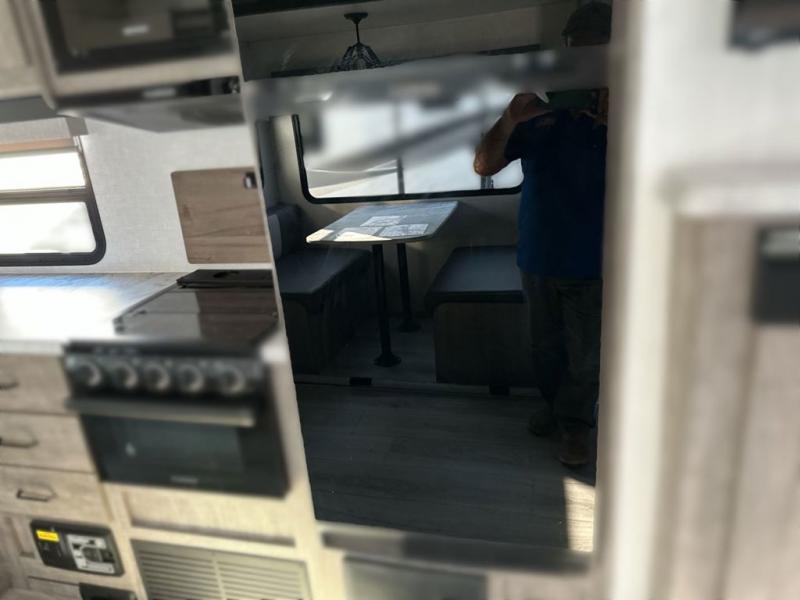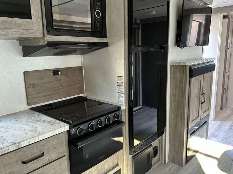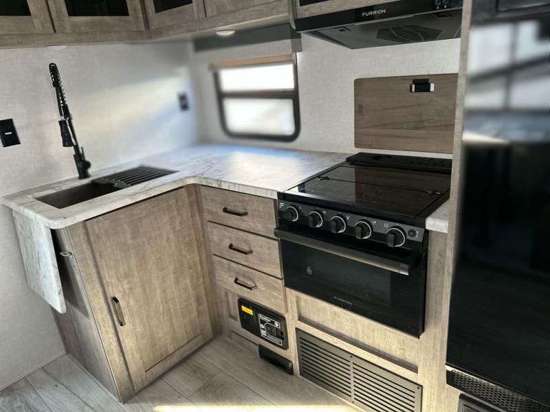 No need to rough it when you camp; this trailer offers amenities that allow you to "Glamp" if you want! The rear spacious bathroom is tucked away behind a beautiful barn door, and inside features a 30" x 36" shower, wardrobe, and linen storage. The front master bedroom offers privacy, a walk-around queen bed, two wardrobes, "Cubbie" storage at the head of the bed, USB ports for your electronics, and massive under bed storage for extra blankets and pillows. The L-shaped counter in the kitchen provides enough space to have everything at your fingertips while you cook, plus there is a countertop extension for more prep and serving space if needed. A nice walk-in pantry just inside the entry door will be perfect for chips and snacks or canned goods for those longer camping trips. If dining inside, the booth dinette with EZ-Access storage beneath will be comfortable plus you will enjoy the view provided by the panoramic windows within the slide out. An outside kitchen will be a favorite for anyone that cooks, and the 19' awning will provide some protection from the elements and offering an outdoor living area to enjoy with everyone.