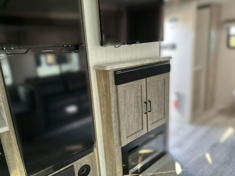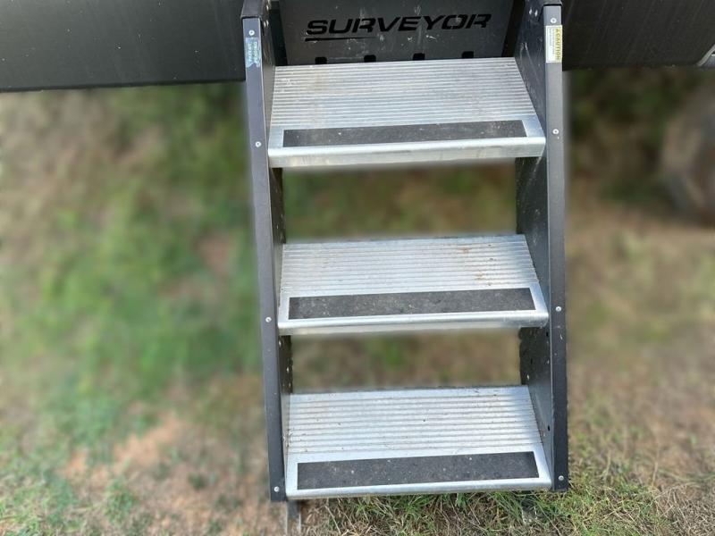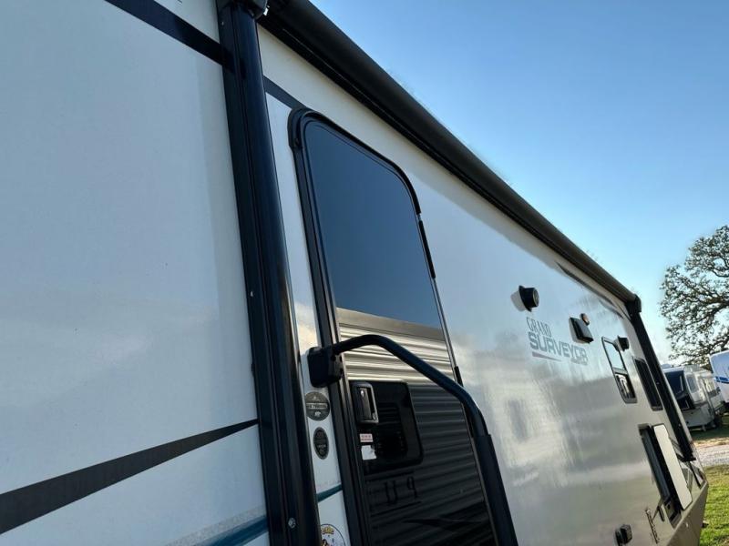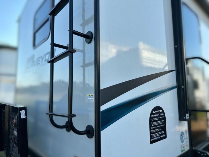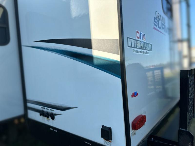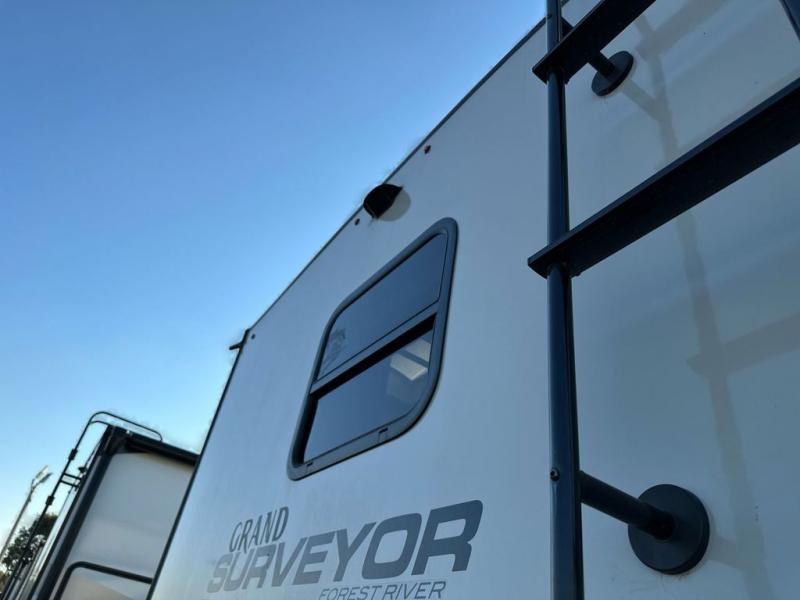 With any Grand Surveyor travel trailer by Forest River you will enjoy turn-key ready-to-go features and quality construction! Each model includes Azdel composite walls and a gel coated fiberglass front cap with an automotive style tinted windshield for a sleek look. There are friction hinge black glass entry door(s), an adjustable platform step with a night light, a power tongue jack, plus many more exterior conveniences. The interior will have you feeling right at home with blackout slow close roller shades, residential faucets, sinks, and bathroom vanity, plus Surf(x) seamless countertops throughout. You can also plan for adventure with a rear bike/utility rack included and there is a Bluetooth soundbar with speakers to listen to your favorite tunes while you're at the campground!