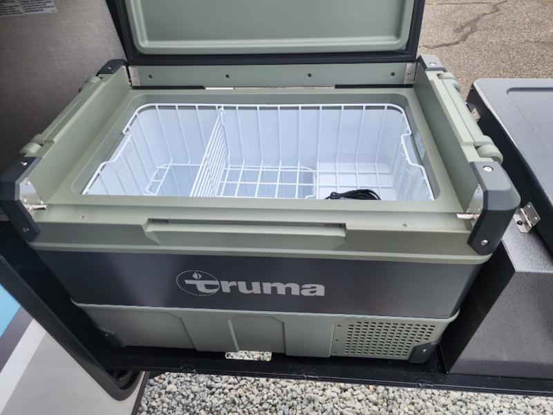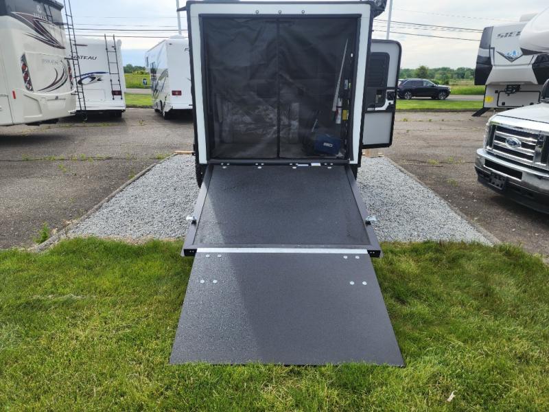 The rear outdoor kitchen includes a two-burner cooktop, sink, and a large refrigerator, facilitating convenient meal preparation. Inside, the trailer offers a queen-sized bed/sofa combo, a cozy fireplace, and a 12V TV, ensuring comfort and entertainment during your adventures.