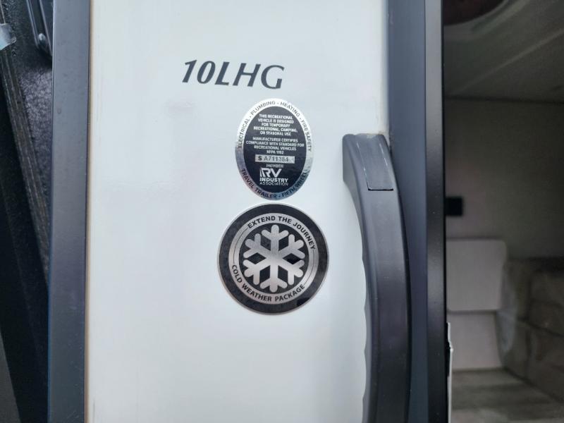 The 10LHG is equipped with the optional Beast Mode package, featuring a CURT independent suspension system, all-terrain tires, and increased ground clearance. This setup allows for confident travel over rough terrain, making it ideal for backcountry camping. Additionally, the trailer includes a heated and enclosed underbelly, tank pad heaters, and an enclosed termination system, enhancing its durability and off-road readiness. -