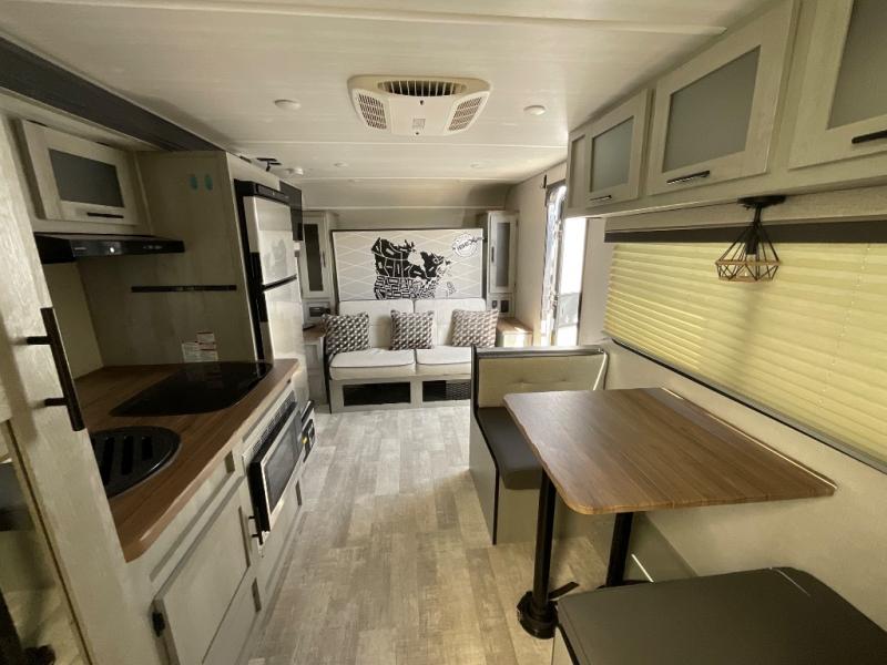 Seek adventure with this trailer in tow! After exploring outdoors each day, you can relax inside on your own sofa or at the booth dinette after cooking a meal using the slide out with kitchen amenities which offers a way to make warm meals, store leftovers in the refrigerator and provides more floor space to move around. The rear bathroom is spacious and includes a shower and a bath wardrobe. When you get sleepy, the Murphy bed up front can easily be set up, and there is more storage along the sides. Don't forget about the 14' awning that offers an outdoor living area. Just grab your camping chairs from the pass-through storage. And you might like to add the optional Unplugged Package that comes with premium lithium-ion batteries, an easy view control panel, a high efficiency A/C, and more!