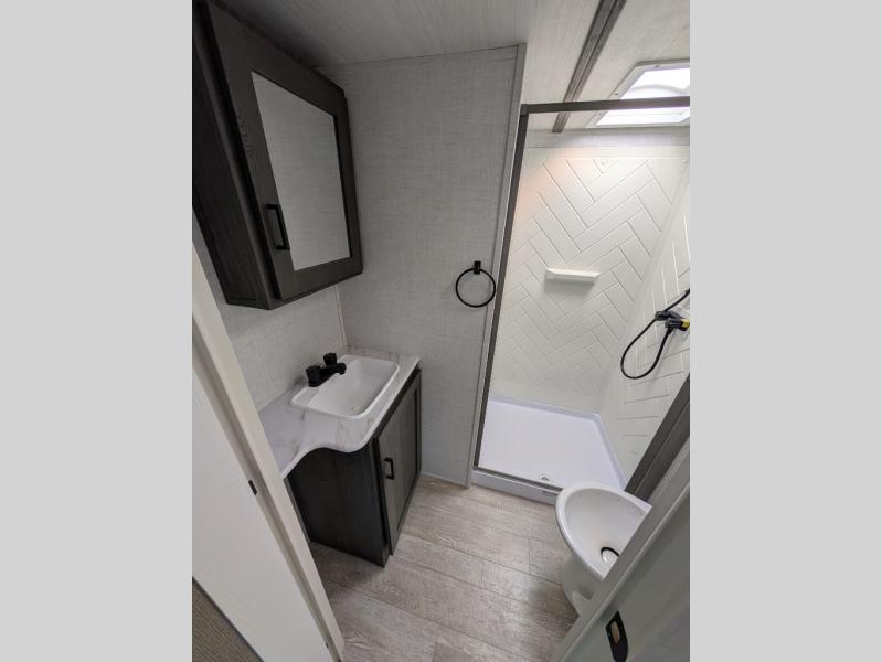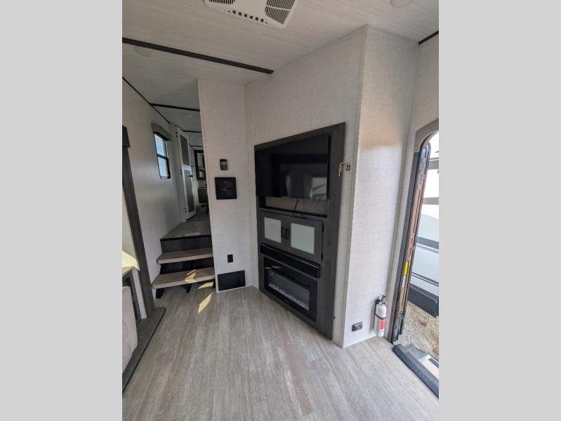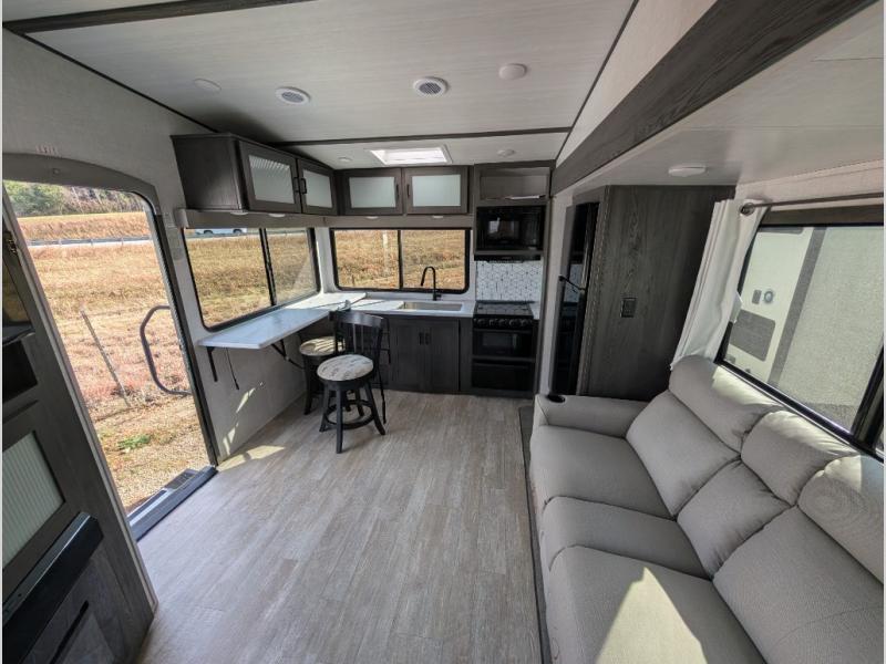 This unit is a perfect couples coach with plenty of space thanks to a large slide opposite the entry door. You will love the rear kitchen which includes large rear facing and camp facing windows to bring your view right inside. You will also find another large window above the theater seat within the slide. Easily enjoy cooking with all the necessary amenities including a 12V refrigerator, microwave oven, range, and sink. Counter space with added bar stools becomes a convenient place to enjoy your meals. A private front bedroom with a queen bed and double wardrobes makes a relaxing retreat when you retire for the evening, and the bathroom features a nice size walk-in shower with skylight for more natural lighting. If you are full-time RVers, you may wish to add the optional washer/dryer that has been prepped for you inside a third wardrobe in the bedroom. You are also sure to love the unobstructed pass-through storage outside for all of your outdoor camping gear and games. There is also some hidden storage to the right of the entry door behind a 40" LED TV and soundbar!