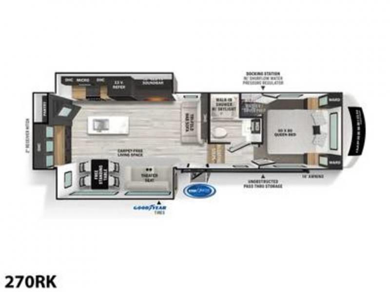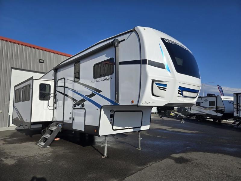 With any Impression mid-profile fifth wheel by Forest River, the focus of the design is comfort and value, built with quality craftsmanship and attention to customer's desires in each Impression! The exterior includes upgraded E-rated Goodyear Endurance tires made in the U.S.A., custom exterior graphics package, and One Touch automatic leveling system for easy setup. There is also an enclosed docking station and a gel coat fiberglass front cap with an automotive windshield with LED lights for style and beautiful views. The fully heated and enclosed AccessiBelly has removable underbelly panels and offers four seasons of travel. The interior has oversized opening windows in the living area for more natural lighting and good air flow, a stainless steel single bowl sink with high rise faucet with a pulldown sprayer to easily clean the dishes, and a porcelain foot flush toilet to mention a few comforts and conveniences.