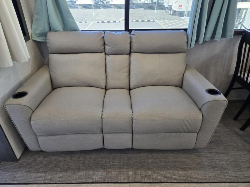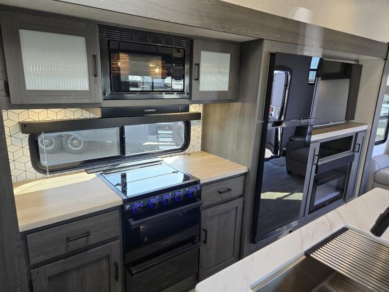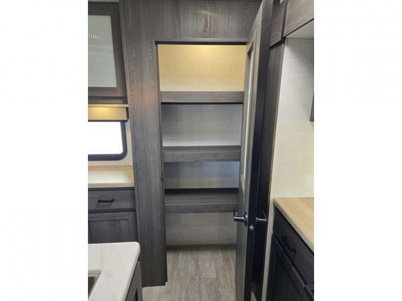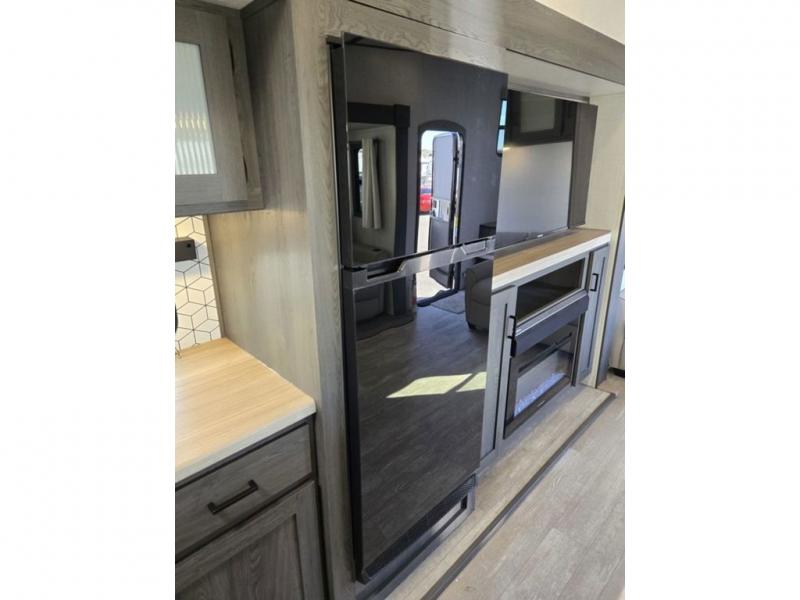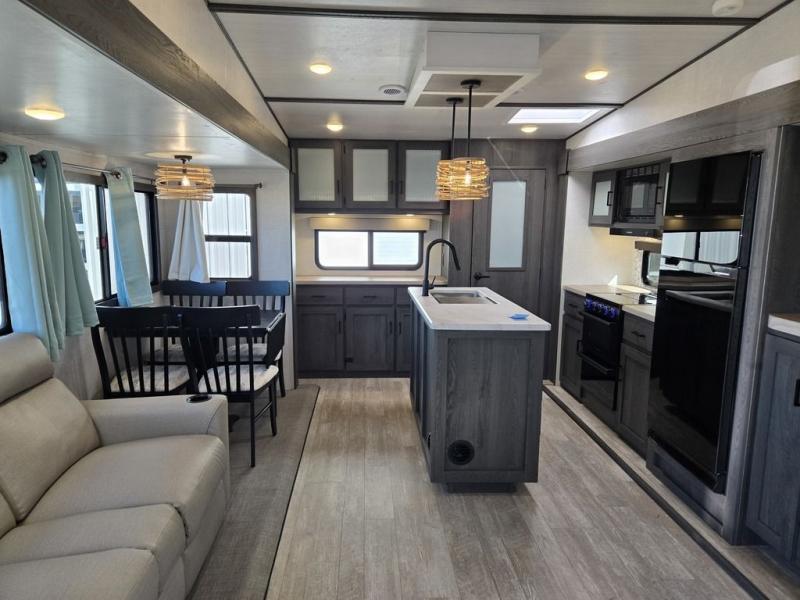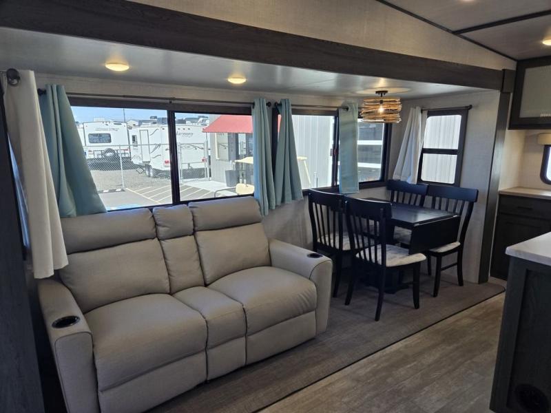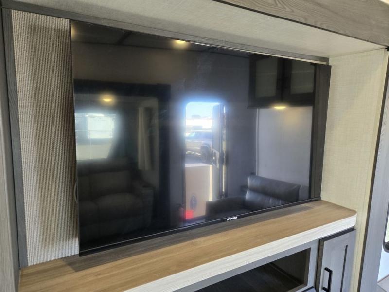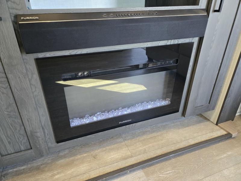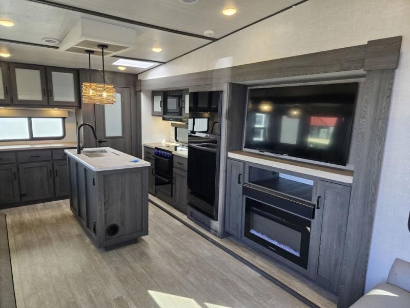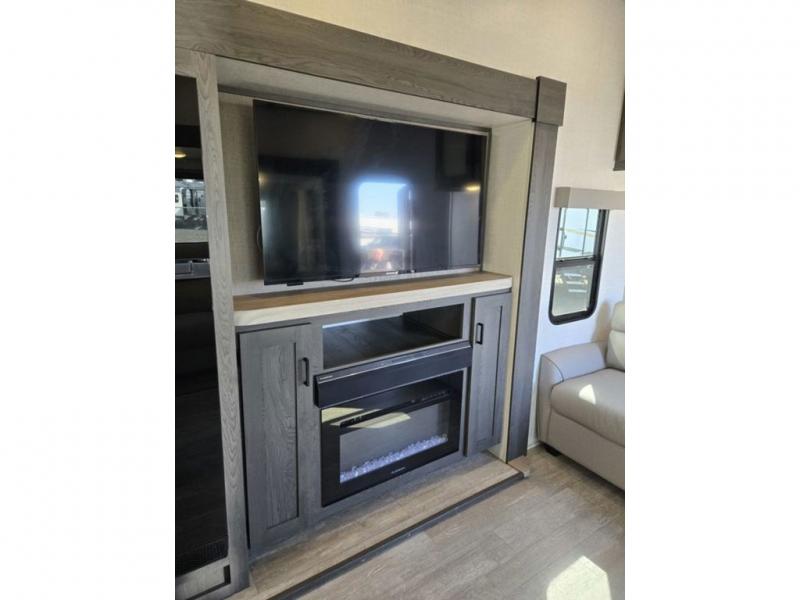 This fifth wheel is spacious, inviting and comfortable! Walk right inside to the combined kitchen and living area with two opposing slides, or walk around the kitchen island to access the floor-to-ceiling pantry. There is a large counter space plus lots of upper and lower cabinets for your dishes, games, and such. You can dine or even work at the free standing dinette with chairs, and relax on the theater seats with USB ports or the tri-fold hide-a-bed sofa while watching the 50" LED TV with soundbar and enjoying the fireplace below. Get cleaned up in the full bathroom and fall quickly to sleep on the walk-around queen bed in the front bedroom that includes three wardrobes, a space prepped for a washer/dryer option, plus nightstands.