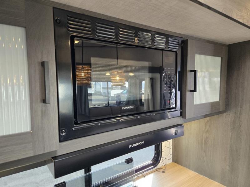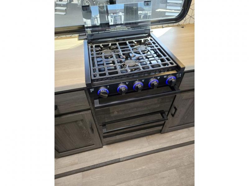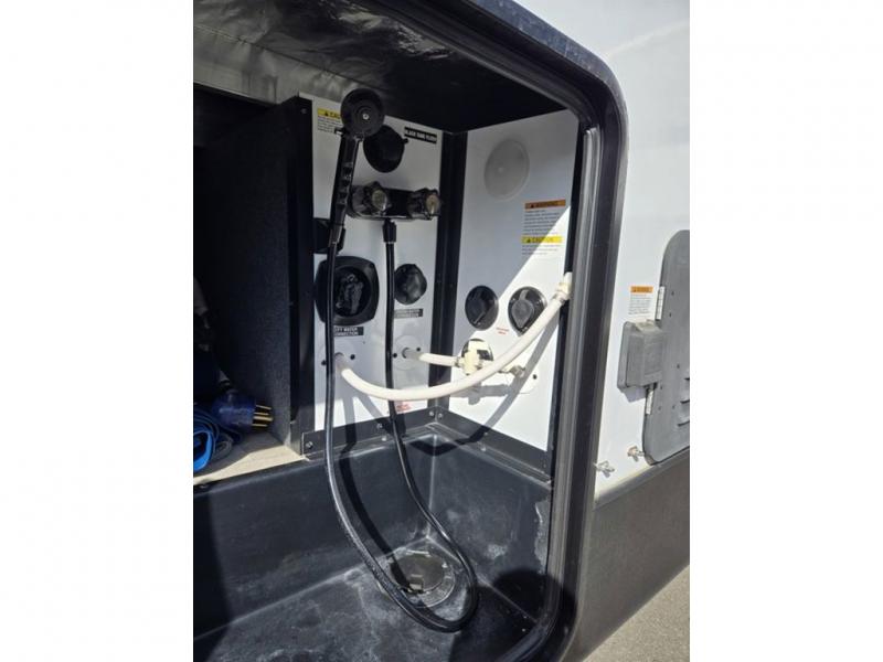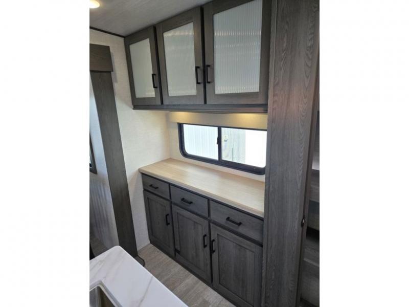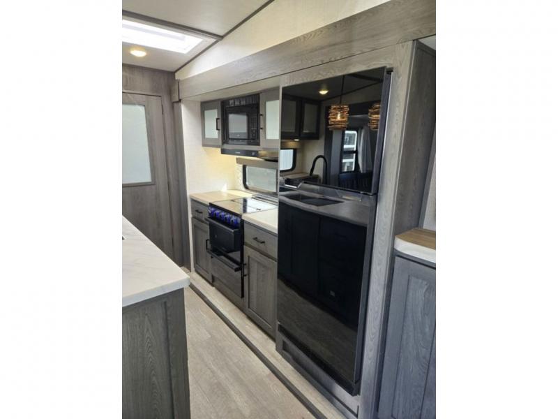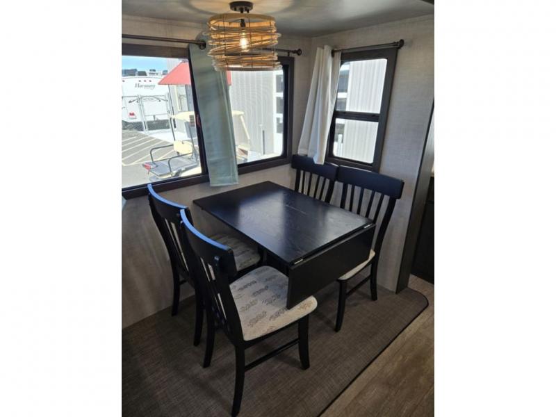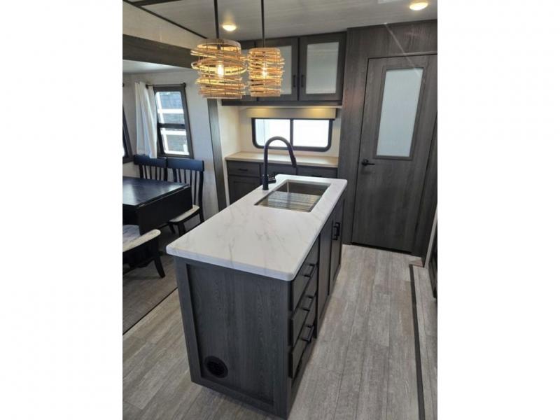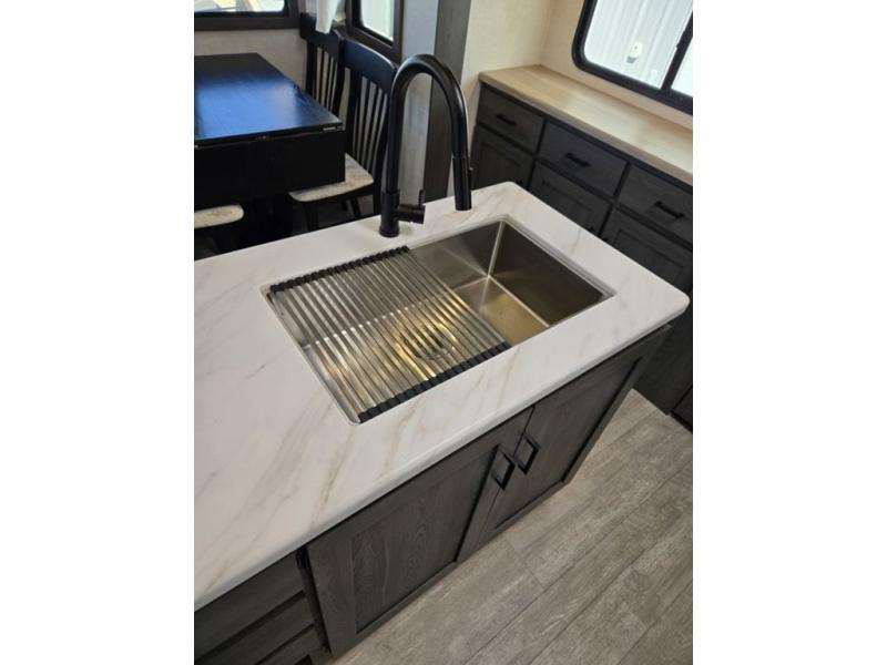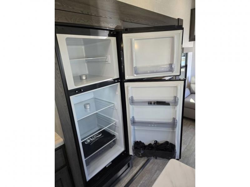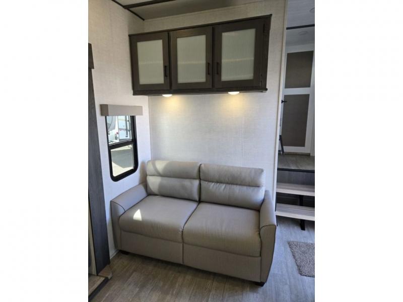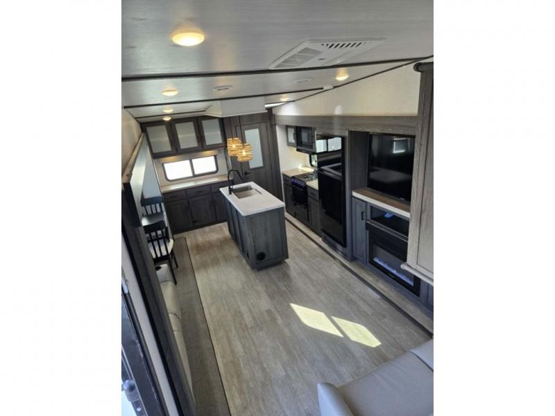 This fifth wheel is spacious, inviting and comfortable! Walk right inside to the combined kitchen and living area with two opposing slides, or walk around the kitchen island to access the floor-to-ceiling pantry. There is a large counter space plus lots of upper and lower cabinets for your dishes, games, and such. You can dine or even work at the free standing dinette with chairs, and relax on the theater seats with USB ports or the tri-fold hide-a-bed sofa while watching the 50" LED TV with soundbar and enjoying the fireplace below. Get cleaned up in the full bathroom and fall quickly to sleep on the walk-around queen bed in the front bedroom that includes three wardrobes, a space prepped for a washer/dryer option, plus nightstands.