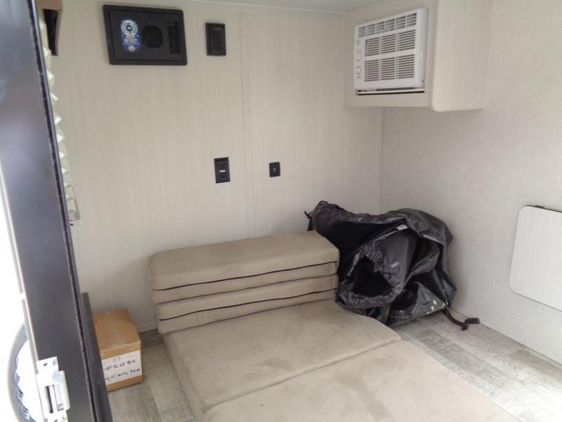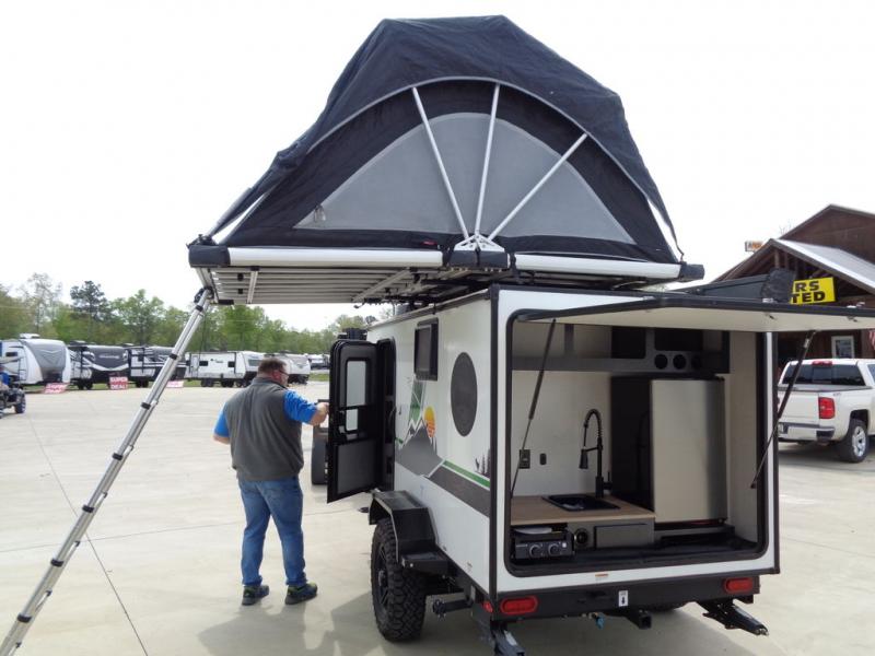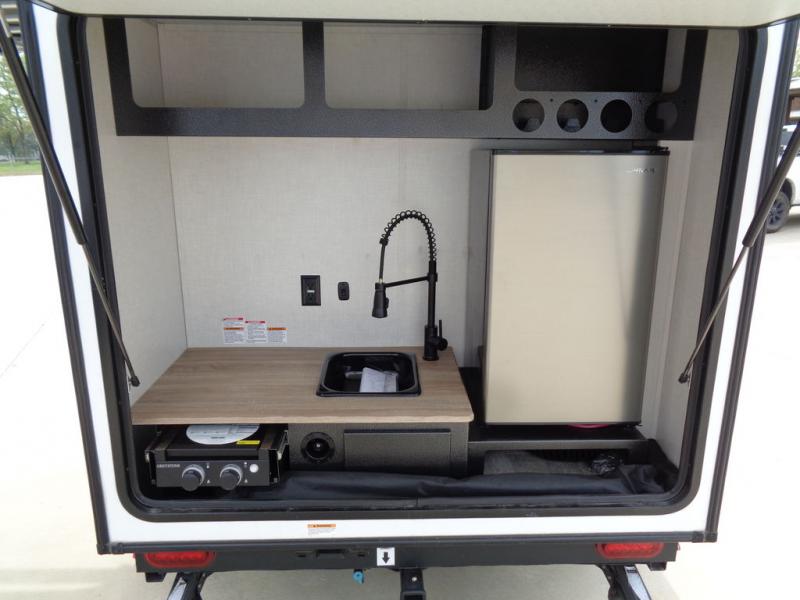 This simple travel trailer weights under 2,000 lb. for the easiest towing experience! After you've traveled all day, you can take a rest on the queen-sized bed/sofa combo inside and enjoy the fireplace. There are dual wardrobes plus additional interior storage for your belongings. You can make lunch on the two burner cooktop, clean up using the sink, and store perishables in the convenient refrigerator!