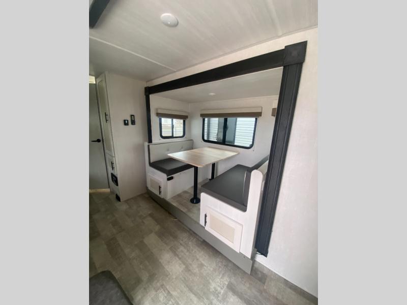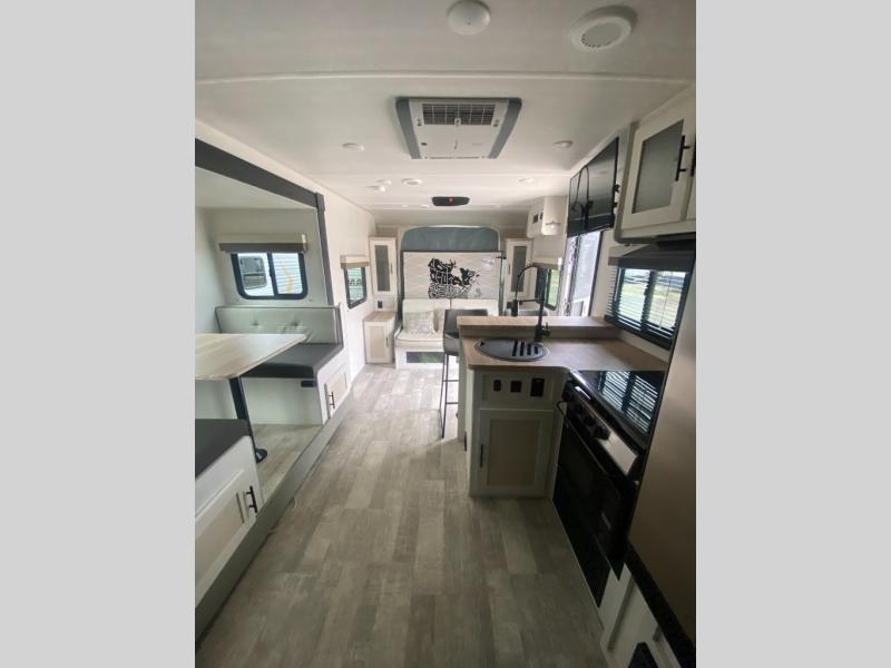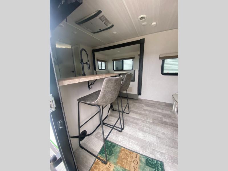 This camper features the Beast Mode Suspension System, and the Un-Plugged package to take your camping experience to a whole new level. 600 watts of solar, premium Lithium-ion batteries, a 3,000 watt inverter charger, a high-efficiency A/C that runs off of the FOUR included batteries, and more. Pack up this very versatile Murphy bed travel trailer and head out to explore! You will love the space saving aspect that a Murphy bed gives you by not increasing the tow length in order to give you a separate bedroom and living space. By combining them and using a Murphy bed you can enjoy living space during the day and a great sleeping space at night, and you don't even have to make the bed, just fold it up into the wall in the morning! Oversized bunks in the rear corner are perfect for accommodating both children and adults. And, with an oversized bath and shower in the rear corner, everyone will easily stay clean and refreshed while you travel. The kitchen offers everything a cook would need to feed the whole gang and there is even a counter bar area with a couple of stools which will be perfect for breakfast time. There is a booth dinette slide for more dining space, or place to enjoy a board game or card game when you are inside, and the central vacuum system is ideal for keeping things tidy while camping and makes cleaning up a breeze as you put things away when you return home.