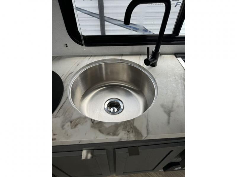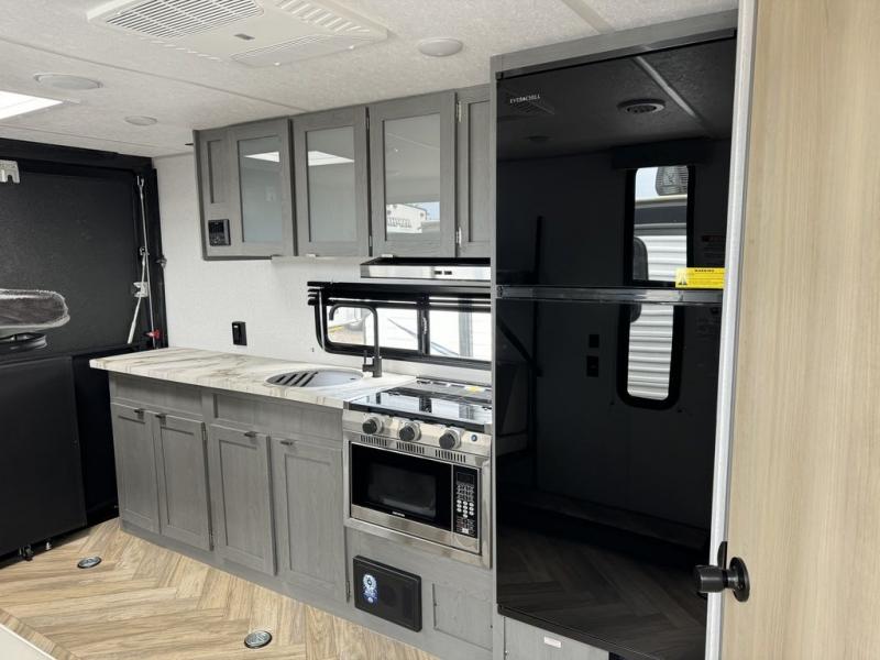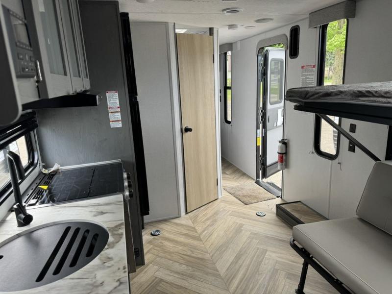 Load up your off-road toys with the ramp door into the 10' 5" garage area in this Ozark toy hauler! Once you reach your destination, unhook your toys from the tie-downs and set up the Stow N Load bunk system above the sofa seating/30" x 72" sleeper. The kitchen has everything you need to prepare your best home cooked meals including the largest-in-class single basin sink for an easy clean up and the dual swinging 12V refrigerator. The full bathroom has a shower for you to clean up in and the outside hot/cold shower lets you rinse the mud off before entering inside. Enjoy a good night's rest on the front queen bed, and there is a wardrobe to keep your clothes looking nice.