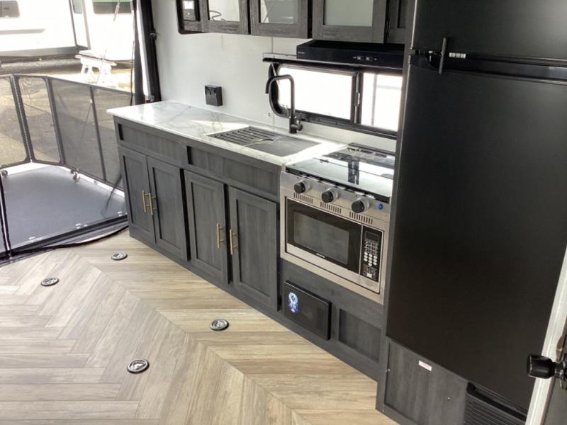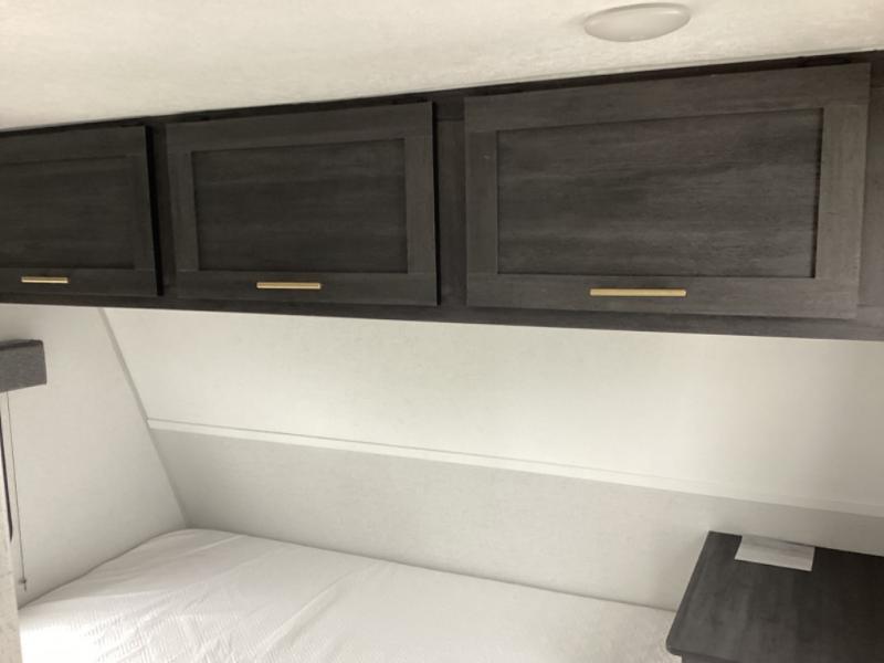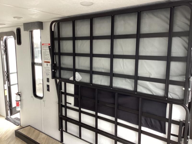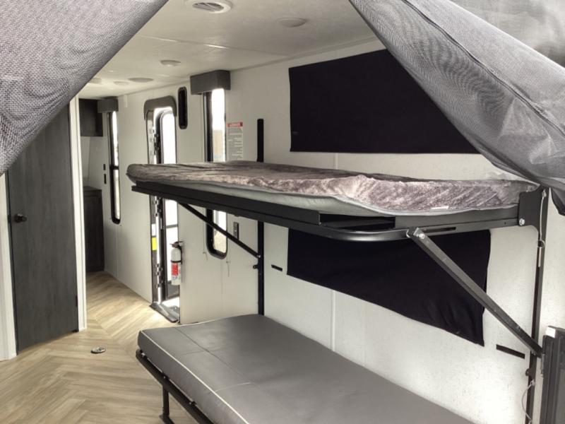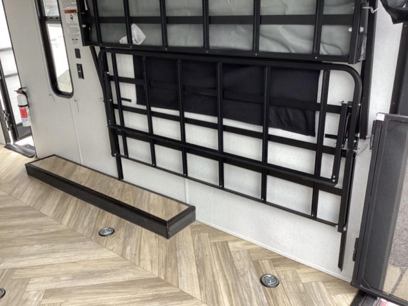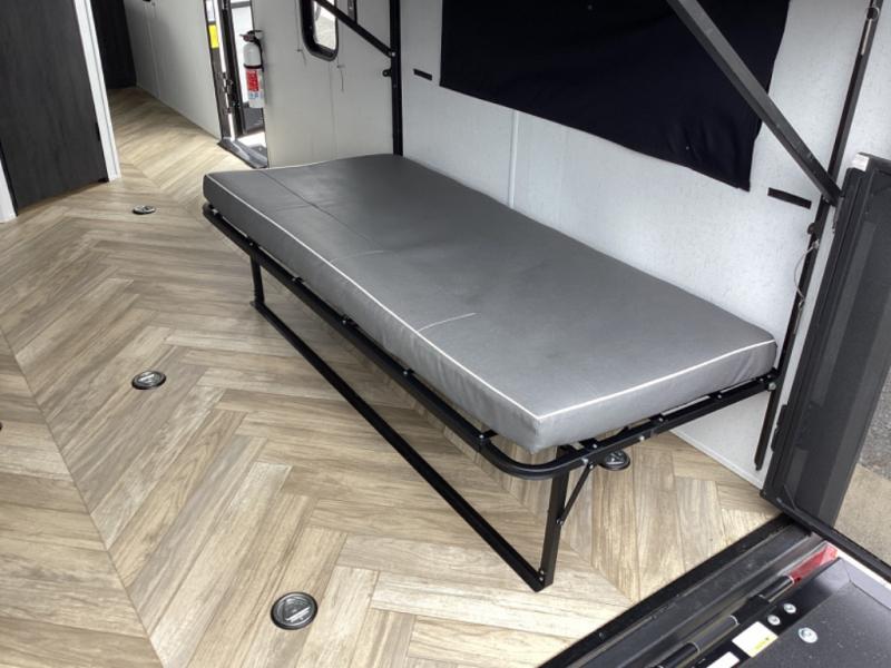 Load up your off-road toys with the ramp door into the 10' 5" garage area in this Ozark toy hauler! Once you reach your destination, unhook your toys from the tie-downs and set up the Stow N Load bunk system above the sofa seating/30" x 72" sleeper. The kitchen has everything you need to prepare your best home cooked meals including the largest-in-class single basin sink for an easy clean up and the dual swinging 12V refrigerator. The full bathroom has a shower for you to clean up in and the outside hot/cold shower lets you rinse the mud off before entering inside. Enjoy a good night's rest on the front queen bed, and there is a wardrobe to keep your clothes looking nice.