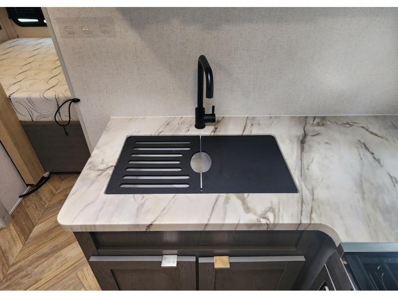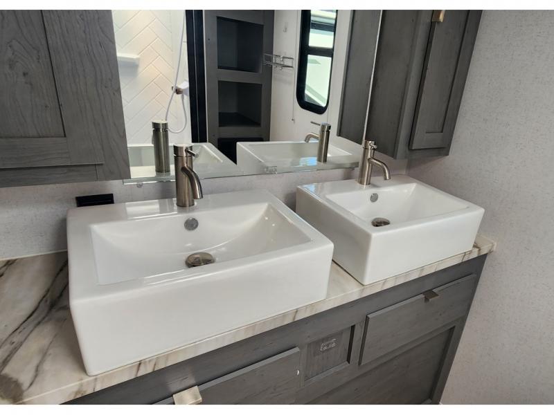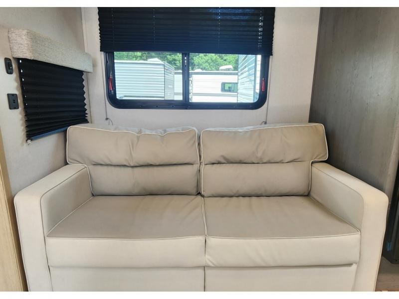 The perfect couples coach or trailer for up to four! You will love the spacious rear bath with large 36" doorway leading into it. Here you will find a shower with skylight, large linen cabinet, and a dual sink vanity. The combined kitchen and living area features one large slide with a tri-fold sofa which is perfect for overnight guests or kids. A breakfast bar features two stools so you can enjoy a meal or cup of coffee inside before heading out under the 19' patio awning. A second skylight found in the kitchen brings in more natural lighting as well. In the front private bedroom you will find a generous wardrobe that has even been prepped for a washer and dryer, and a king bed slide offers more space for dressing. A second entry makes accessing this trailer super convenient, and an exterior griddle and mini fridge allows you to enjoy as much time outside as possible! This model also includes the Ascent Package that includes an Ascent graphics package, upgraded steel wheels, and .040 smooth front metal along with the smooth fiberglass exterior!