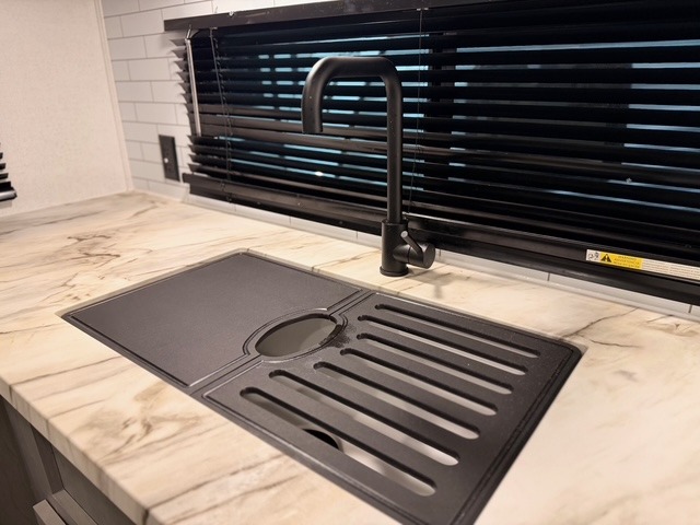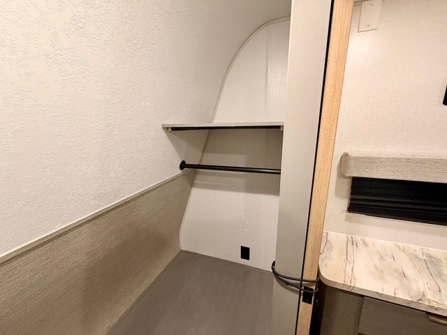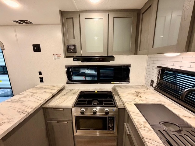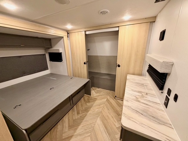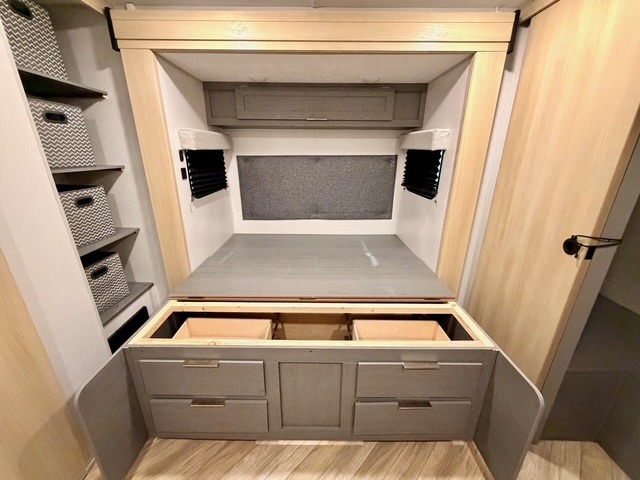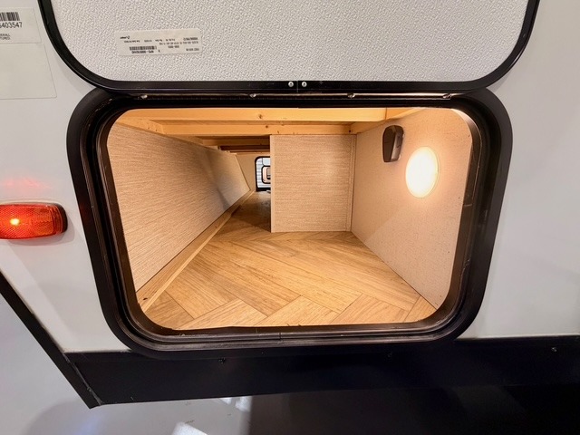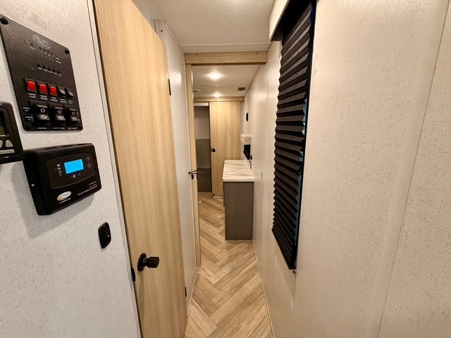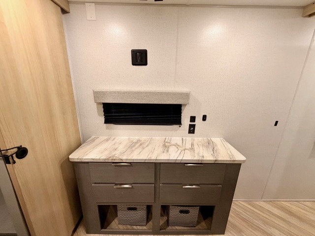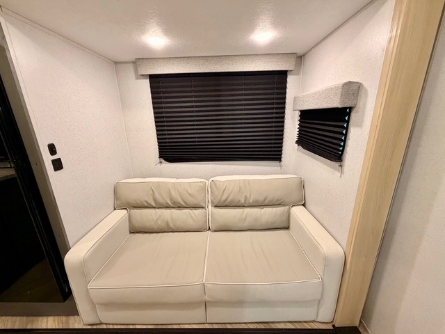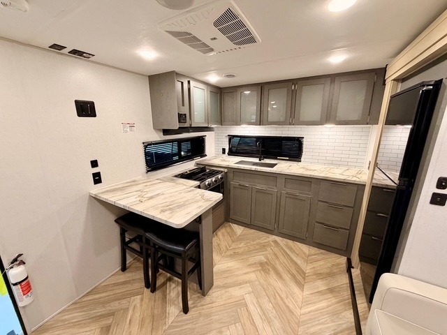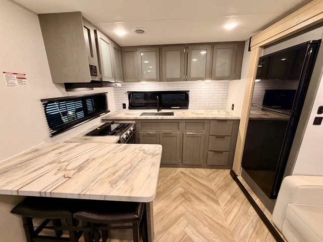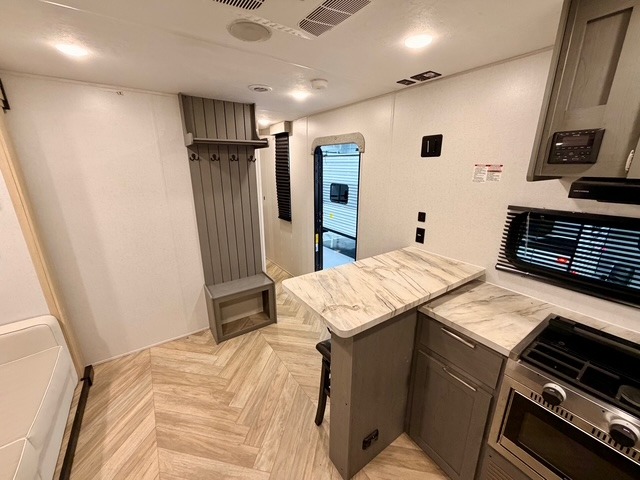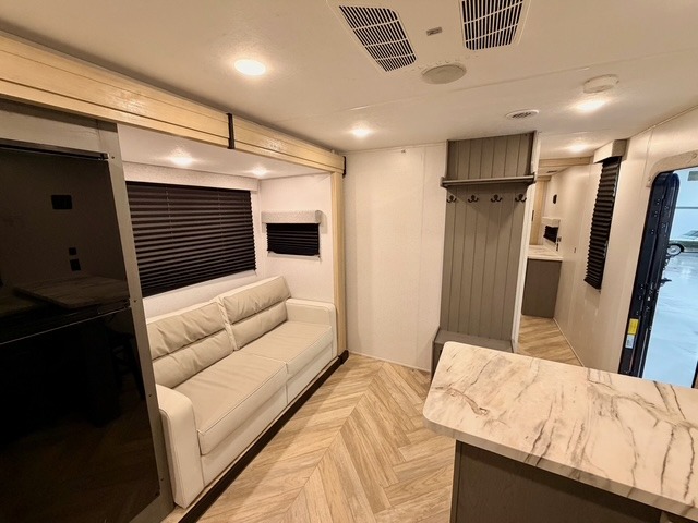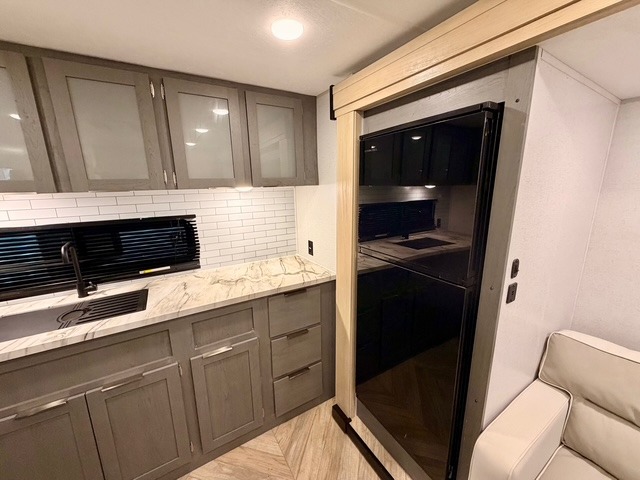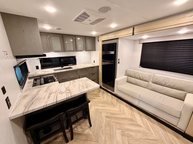 This travel trailer is ultra sleek with its Ascent Package and ultra comfortable with at-home amenities. Once you step inside you'll find the rear kitchen with tons of counter space and the living area with a tri-fold sofa slide with direct TV viewing. There is a bar top with two stools where the little ones can enjoy their breakfast at, and a shoe rack where shoes won't get in the way. Head to the front of the unit to enjoy the private bedroom with a king bed slide out, a dresser with a TV hookup, plus a walk-in wardrobe, complete with washer and dryer prep! And don't overlook the exterior with its outdoor LP griddle and mini refrigerator, Solid Step entry steps, and quick drop stabilizer jacks for maximum stability!