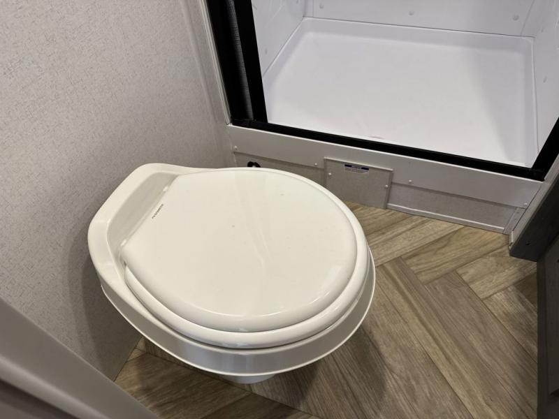 You're going to love spending time in this spacious toy hauler that can sleep four each night. The Ascent Package not only gives you a smooth fiberglass exterior, but also Ascent graphics package, upgraded steel wheels, and .40 smooth front metal. Once you arrive at the campground you can enjoy the patio deck with a railing system on the ramp door and relax on the dual flip-out sofas with a free-standing table in between. The chef of your group can prepare a meal in the full kitchen that includes a microwave, an upgraded appliance package with an oven, plus a dual swinging 12V refrigerator. The full bath is spacious and accommodating with its medicine cabinet and shower skylight, and the front private bedroom will feel just like home. Here, you'll find a king bed slide out, a dresser with a TV hookup, and the large front closet with washer and dryer prep!