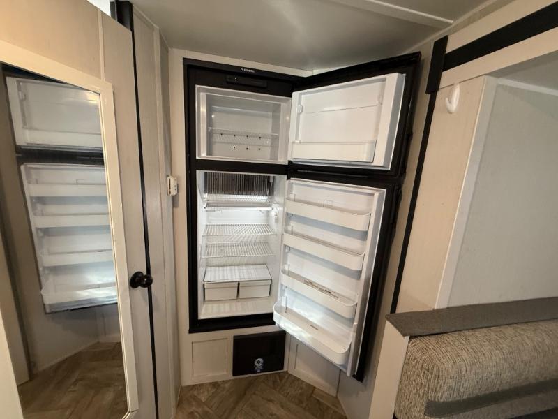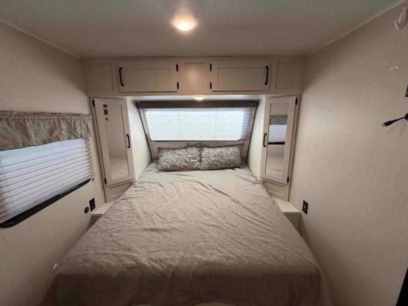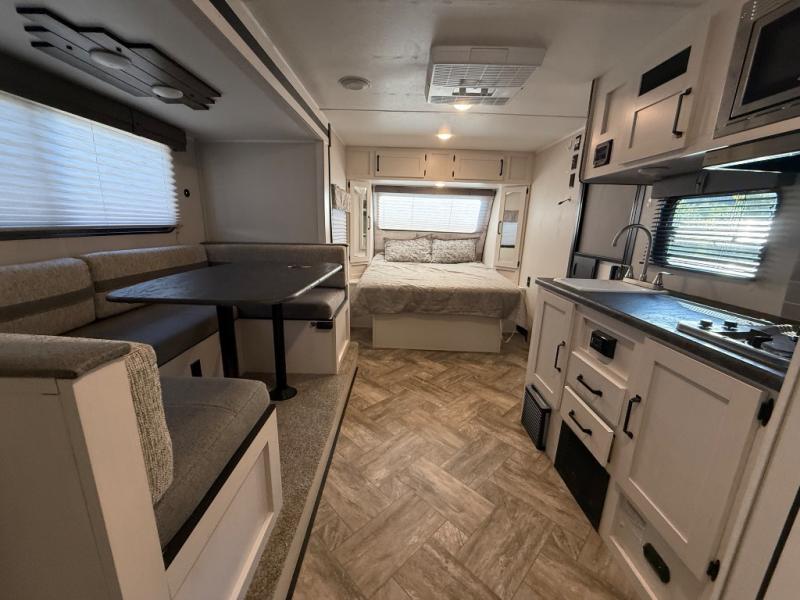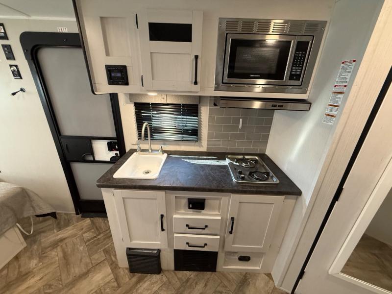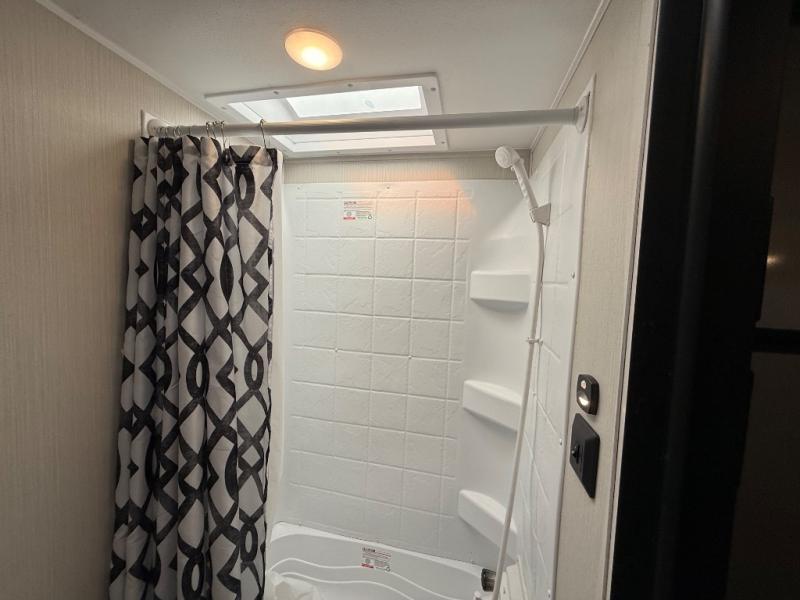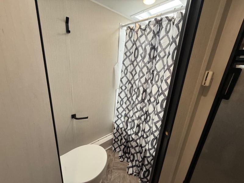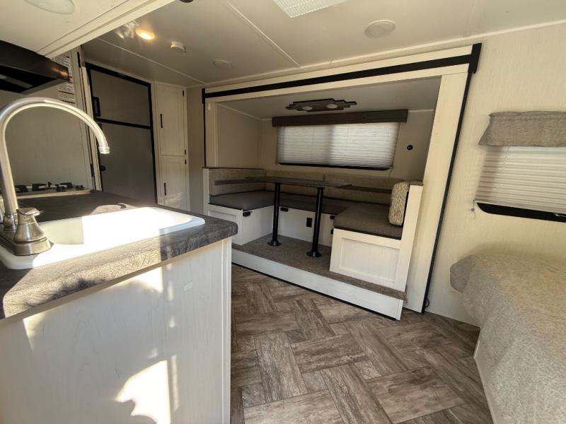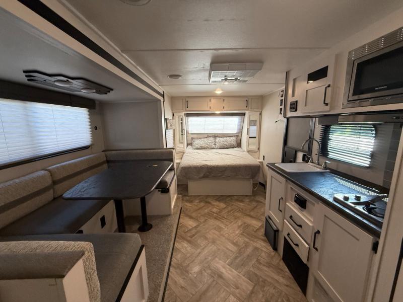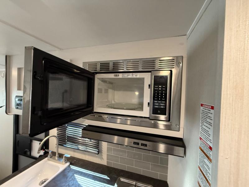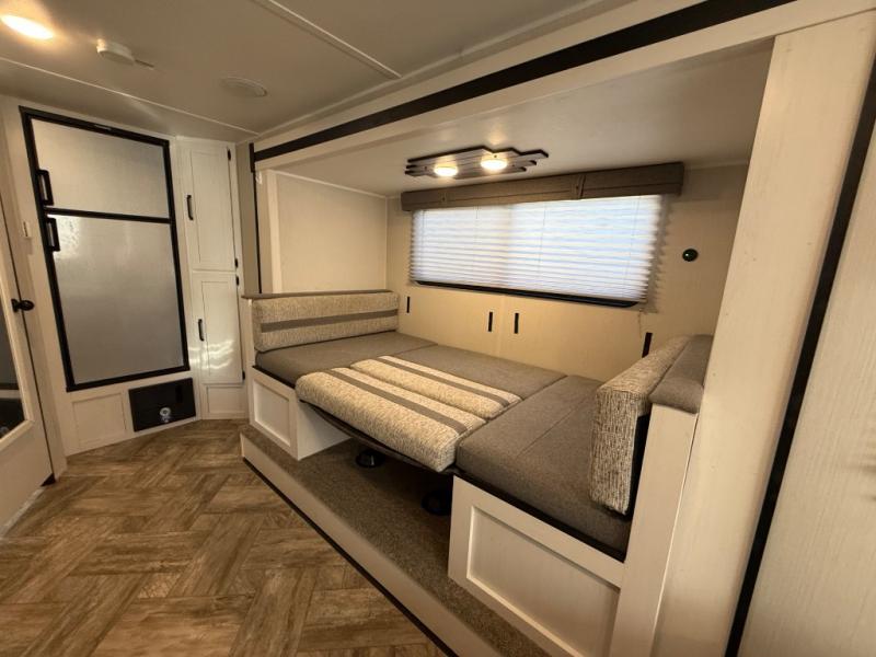 Whether you camp to enjoy the outdoors or prefer to get away with your accommodations to relax indoors with views of the outdoors, either way this trailer is for you! The U-shaped dinette slide offers a window, dining for four, plus a great place to play games, relax and even sleep two when needed. The extra floor space gives you access to the walk-around RV queen bed with shirt closets on each side, the kitchen with a stainless steel microwave and two-burner cooktop, plus the pantry next to the residential refrigerator. And you can change clothes and get cleaned up in the private toilet and shower/tub room.