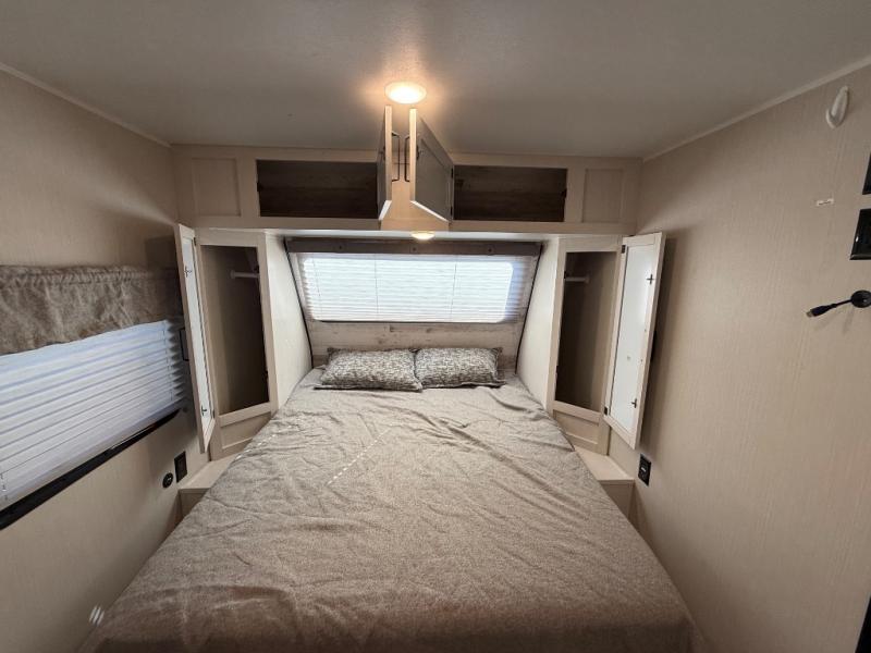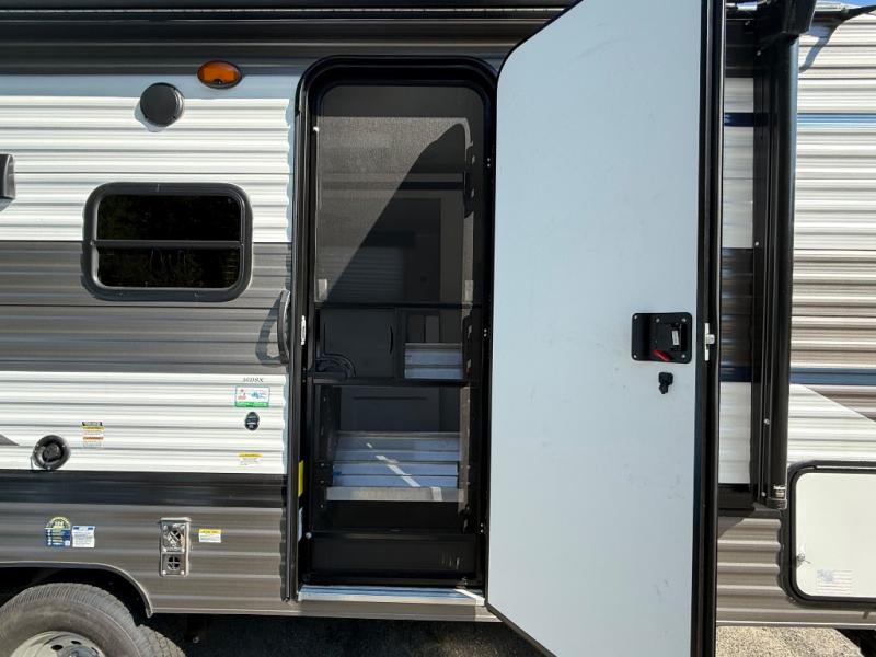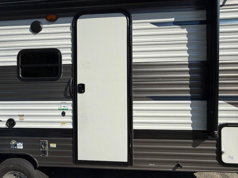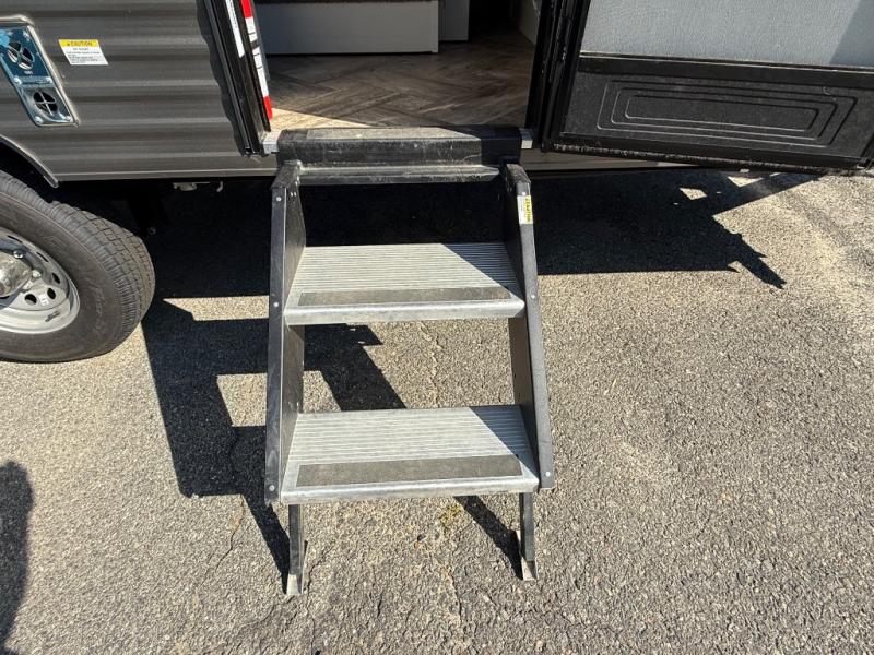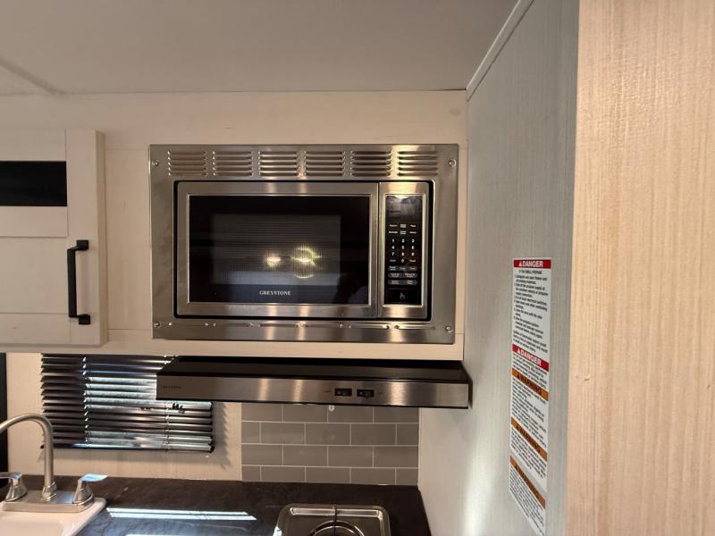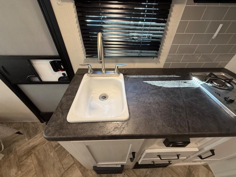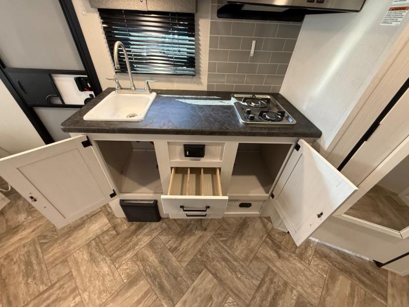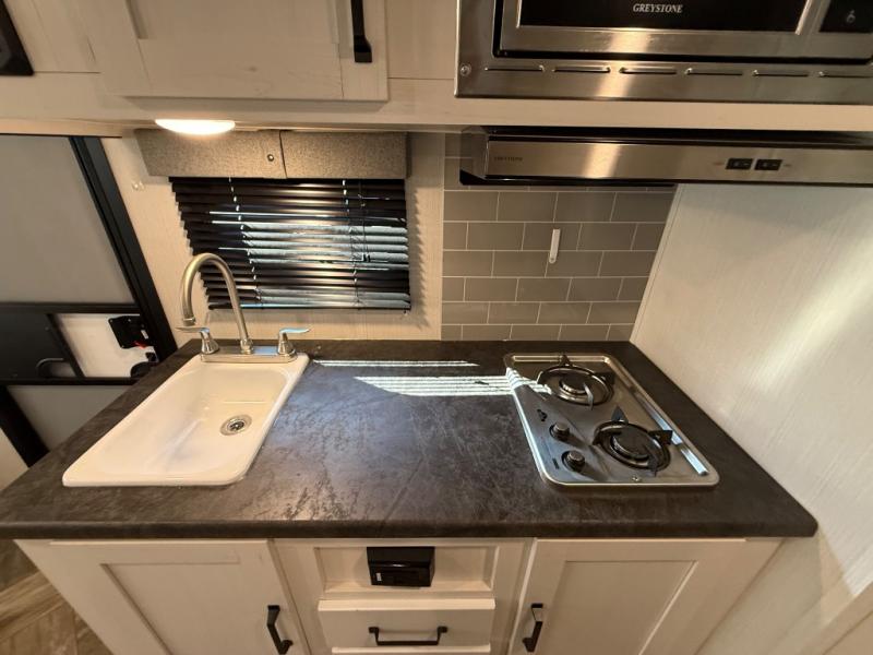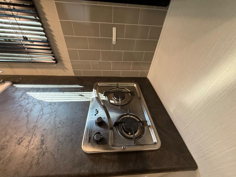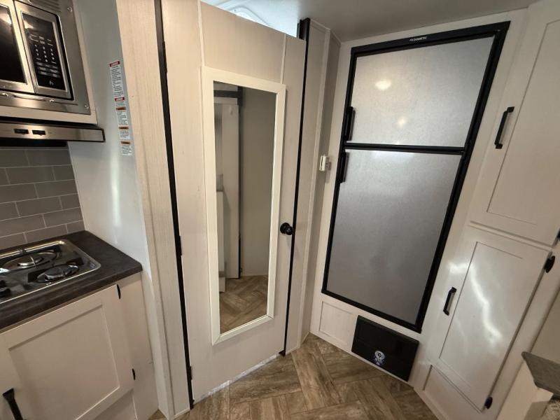 Whether you camp to enjoy the outdoors or prefer to get away with your accommodations to relax indoors with views of the outdoors, either way this trailer is for you! The U-shaped dinette slide offers a window, dining for four, plus a great place to play games, relax and even sleep two when needed. The extra floor space gives you access to the walk-around RV queen bed with shirt closets on each side, the kitchen with a stainless steel microwave and two-burner cooktop, plus the pantry next to the residential refrigerator. And you can change clothes and get cleaned up in the private toilet and shower/tub room.