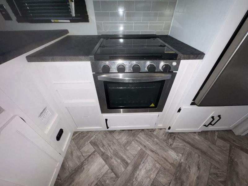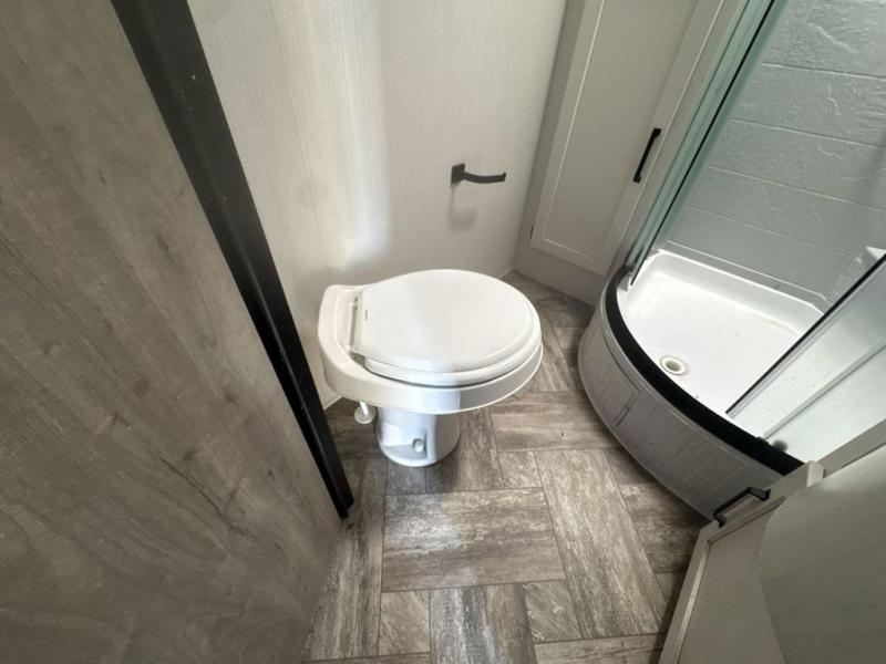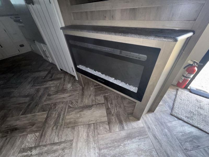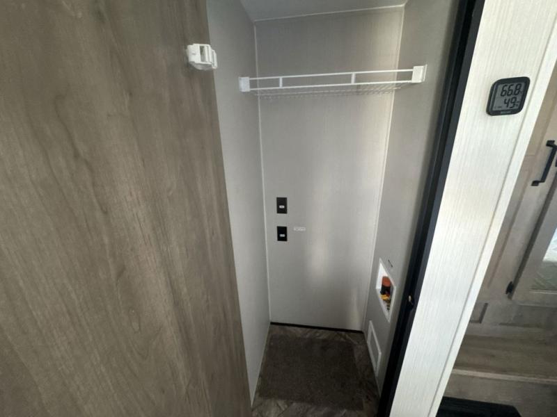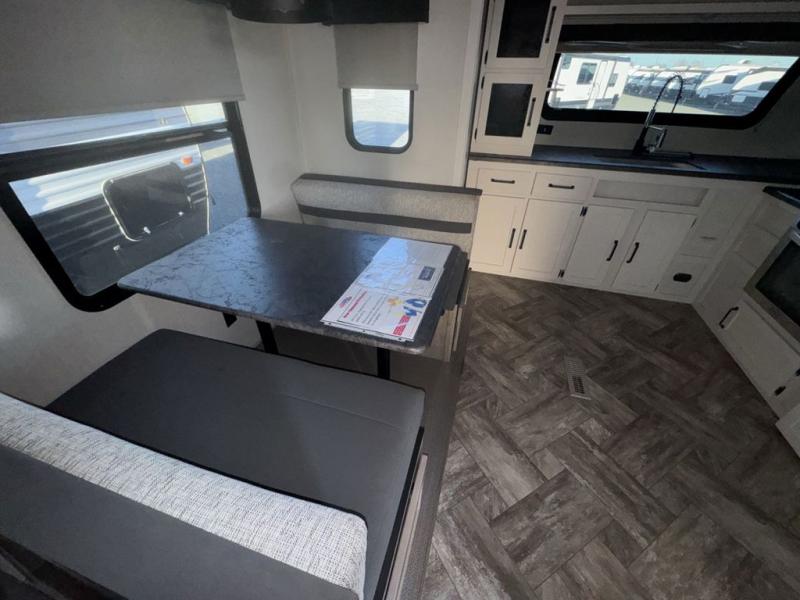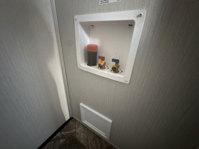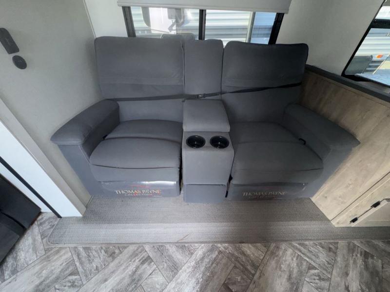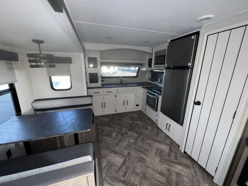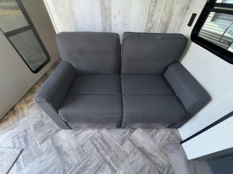 Experience a home away from home with this travel trailer! The front kitchen has everything you will need to prepare your best meals and you can enjoy them at the booth dinette. The rear private bedroom has a 72" x 80" king bed slide across from a dresser, a wardrobe, and a closet next to it that is prepped to add an optional washer and dryer. Freshen up in the full bathroom with the 34" x 34" radius shower and then enjoy a cup of coffee relaxing in one of the two recliners or on the sofa!