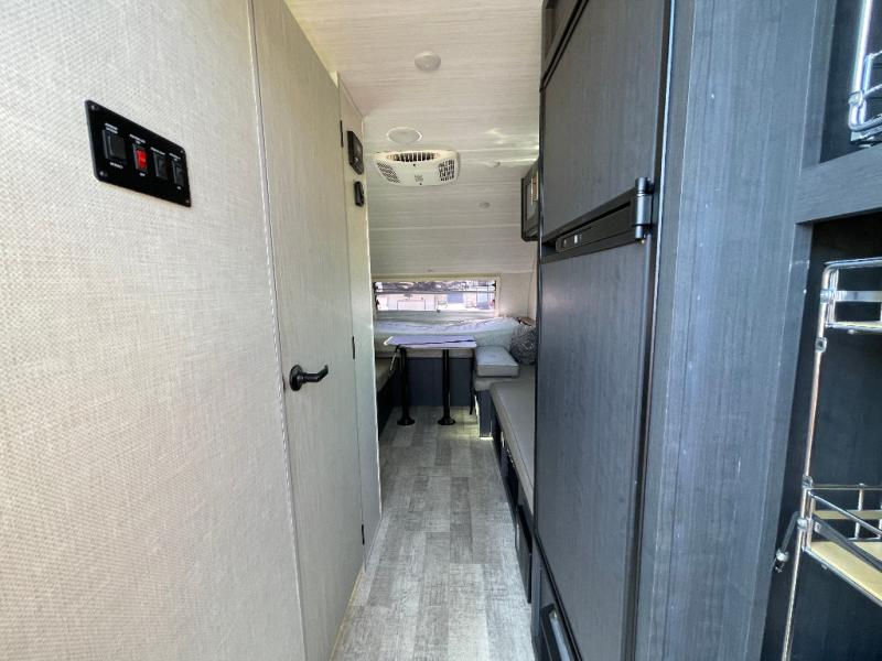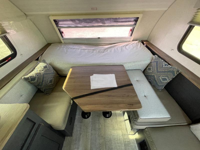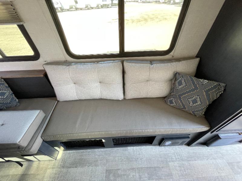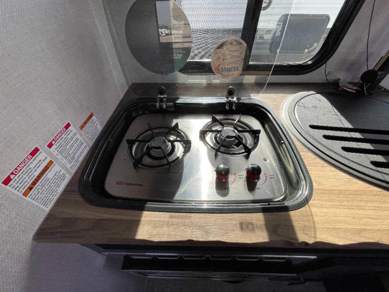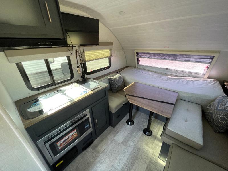 Weekends at the lake just got sweeter in this cozy R-Pod travel trailer. You can prepare your meals each day on the two burner recessed cooktop, or in the convection microwave. There is a sofa to relax on with a good book, plus a booth dinette up front that features a Murphy bed you can fold down at night. This model also includes a refrigerator to keep your perishables fresh, and a pantry to store snacks and dry goods.