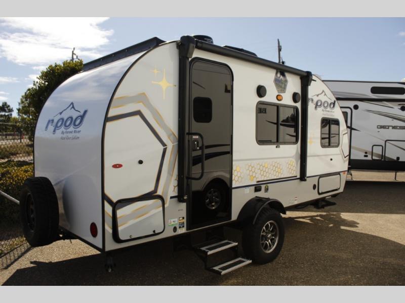 The Forest River R-Pod travel trailer is an excellent choice for lightweight towing! With convenient features like the Azdel composite panels that will completely withstand water damage and designer Carefree flooring that will make it easy to clean up messes, this is a great choice for easy living. The R-Pod has LED exterior lights, outside speakers, and self-adjusting brakes for convenience. Step inside to find decorative window treatments, shaker style cabinetry, seamless kitchen countertops, and a 6' 6" interior height to provide ample room to relax.