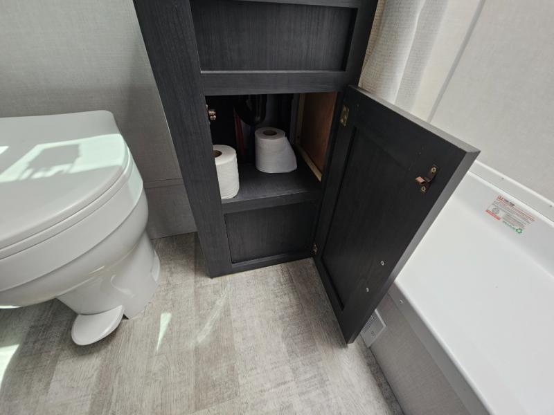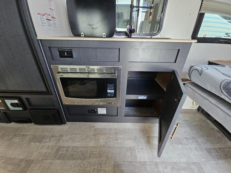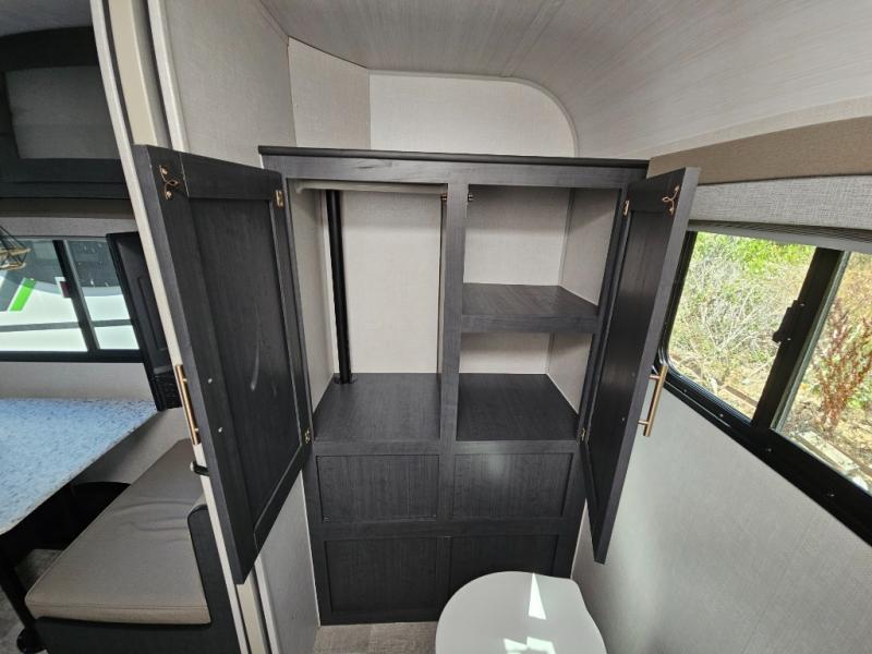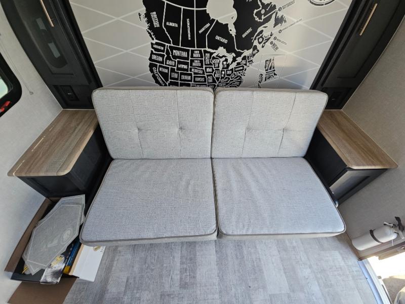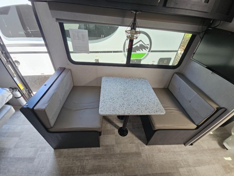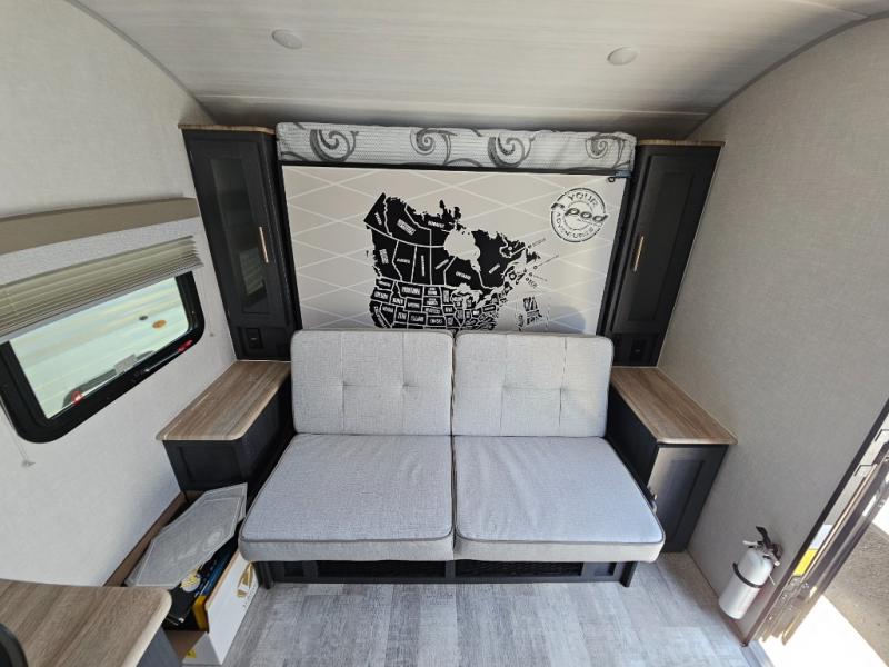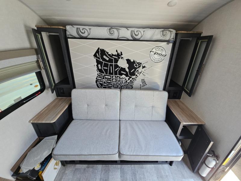You're going to love all of the conveniences and versatility of this R-Pod travel trailer! The front Murphy bed folds away to reveal the sofa which gives you a comfortable place to sit during the day and to sleep at night too. The rear full bath features everything you will need to get squeaky clean each morning as well as a large wardrobe for you to store your linens. After you have whipped up your best meal with the two-burner cooktop, you can head to the 30" x 75" booth dinette and enjoy eating it there comfortably. There is plenty of storage space inside, so you can bring along all the comforts from home!