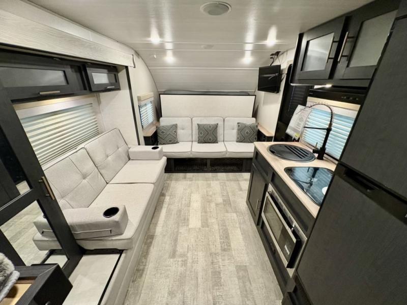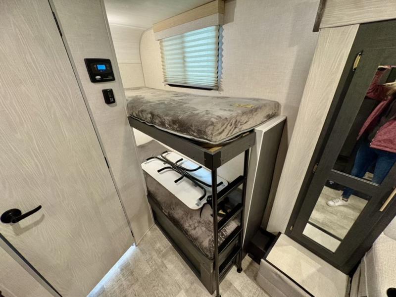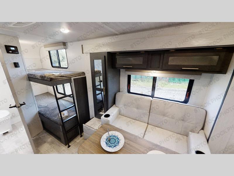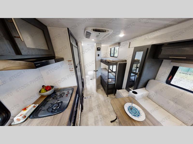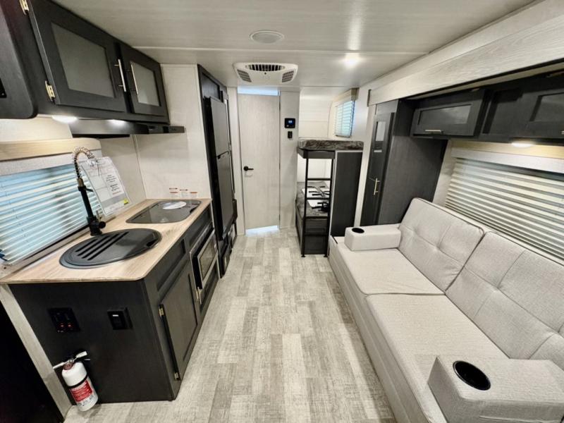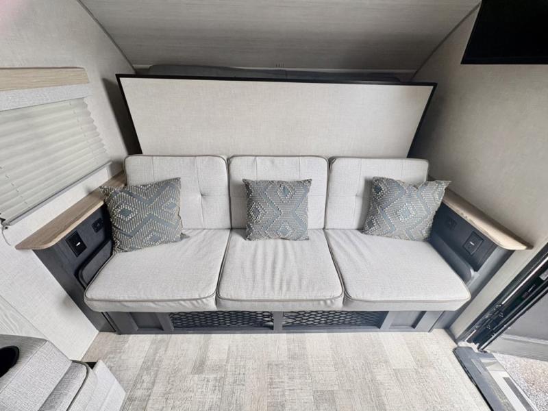 The whole family will enjoy this trailer with sleeping space for five between the bunk beds, the queen Murphy bed and the second sofa within the slide out. This sofa also includes a table for dining, and there is a closet to hang your clothes. During the day you will be able to relax inside while visiting with the cook in the kitchen with full amenities including a pantry for dry good storage. And the bathroom includes a toilet, linen storage, and a shower with a sink, so load up and head out to easily set up and enjoy your own accommodations in the great outdoors.