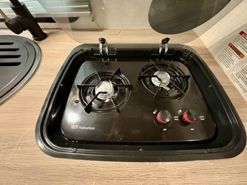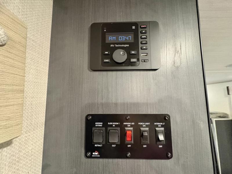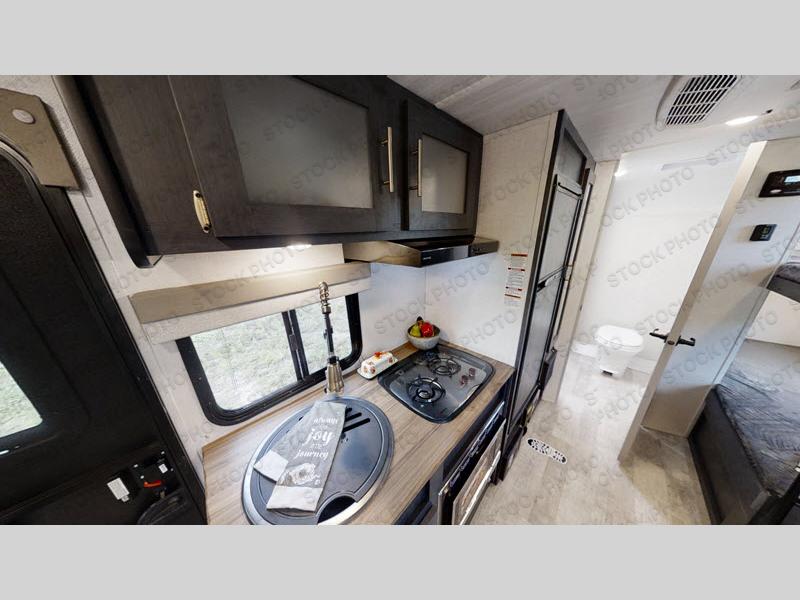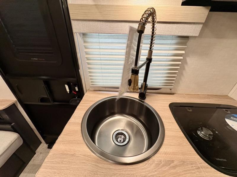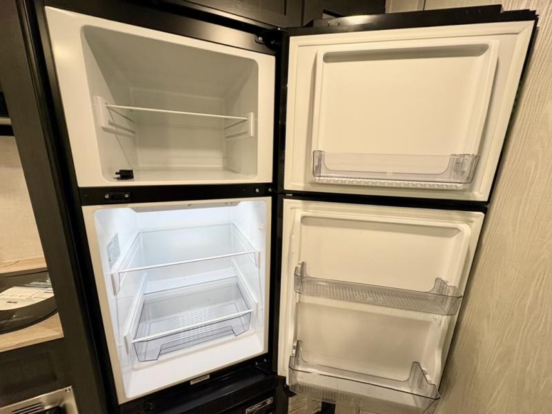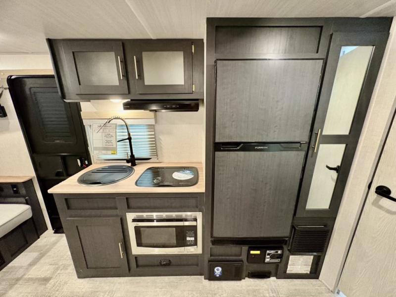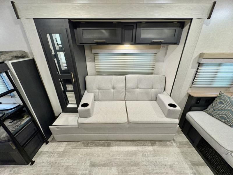 The whole family will enjoy this trailer with sleeping space for five between the bunk beds, the queen Murphy bed and the second sofa within the slide out. This sofa also includes a table for dining, and there is a closet to hang your clothes. During the day you will be able to relax inside while visiting with the cook in the kitchen with full amenities including a pantry for dry good storage. And the bathroom includes a toilet, linen storage, and a shower with a sink, so load up and head out to easily set up and enjoy your own accommodations in the great outdoors.