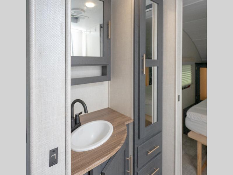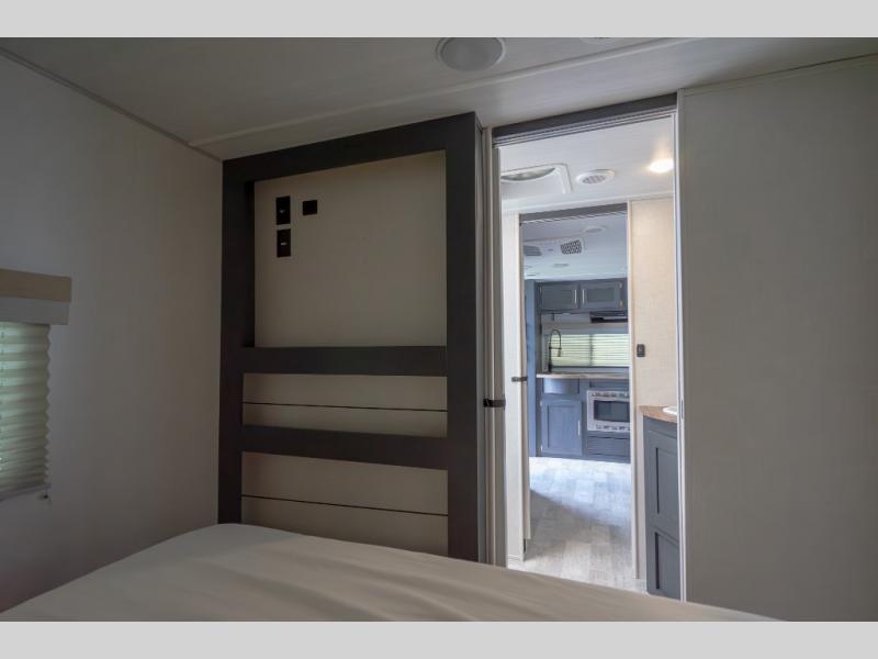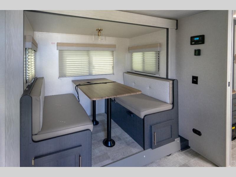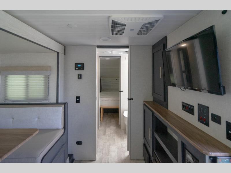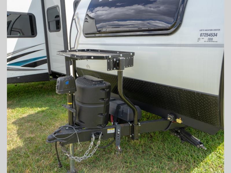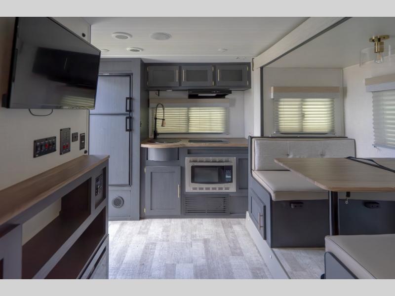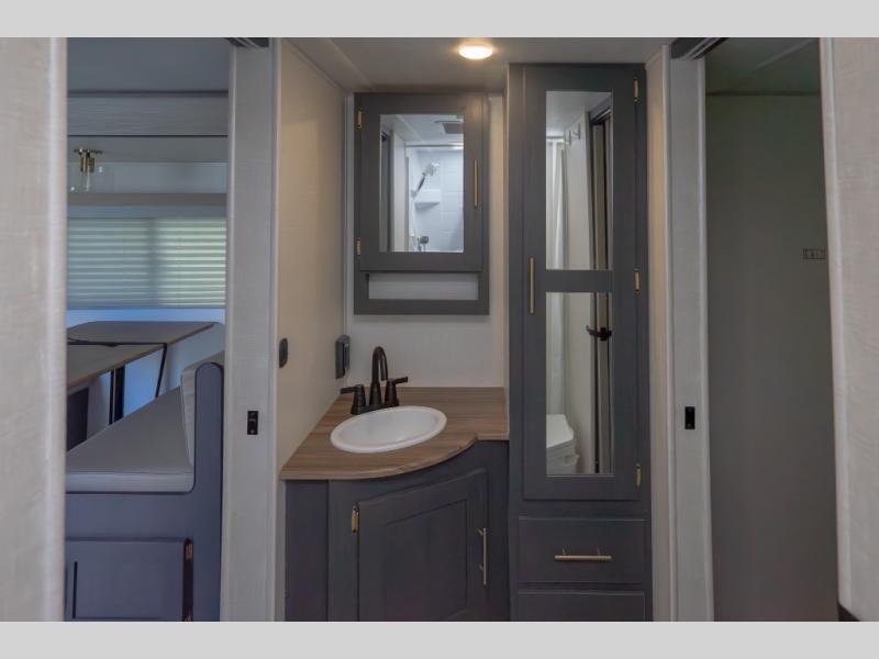 A private bedroom with a walk-around RV queen bed, a walk-through bathroom, and an outside kitchen are a few of the features that you are sure to want in your next RV! You can rest comfortably each night, plus all your clothing can be stored in the dual wardrobes to keep everything tidy. Everyone will stay clean with the full bathroom only steps away, and there is linen storage as well. The main living and kitchen area offers a slide out dinette that can also sleep one more camper. The rear kitchen provides everything you will need, plus the outside kitchen with an outdoor griddle and sink gives you more choices. Step inside to start planning your weekend trip!