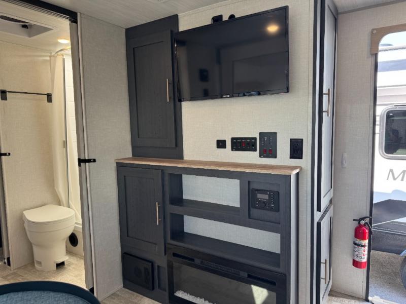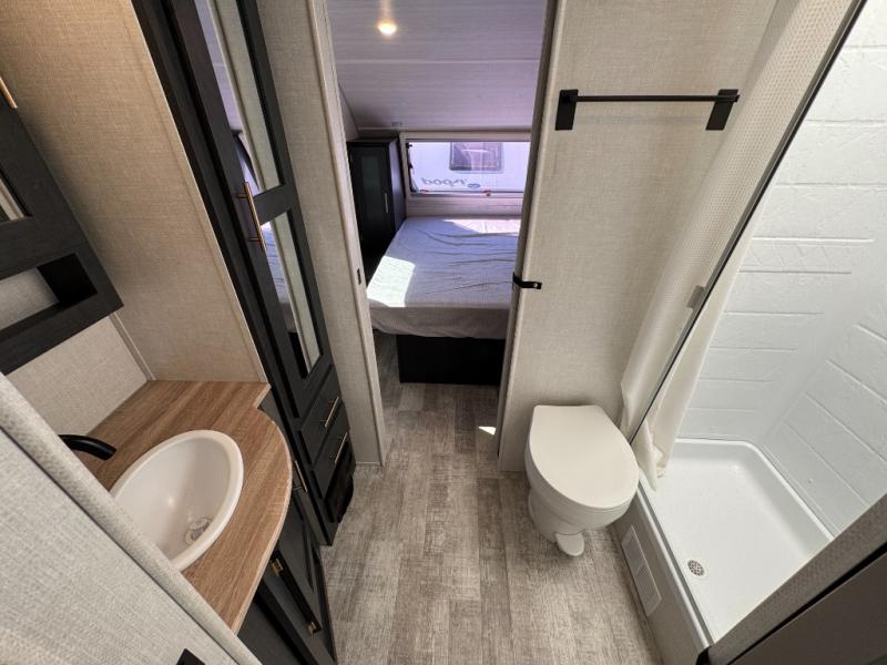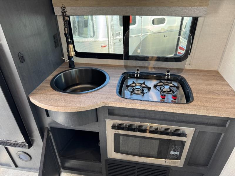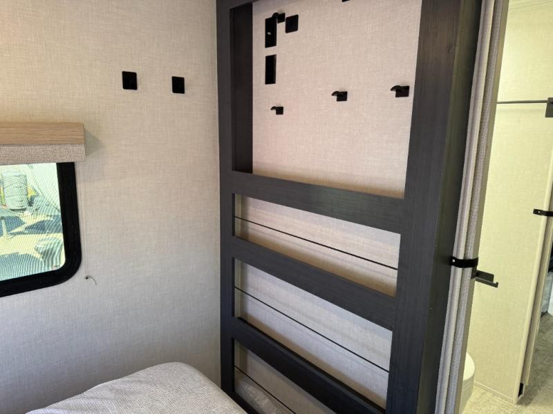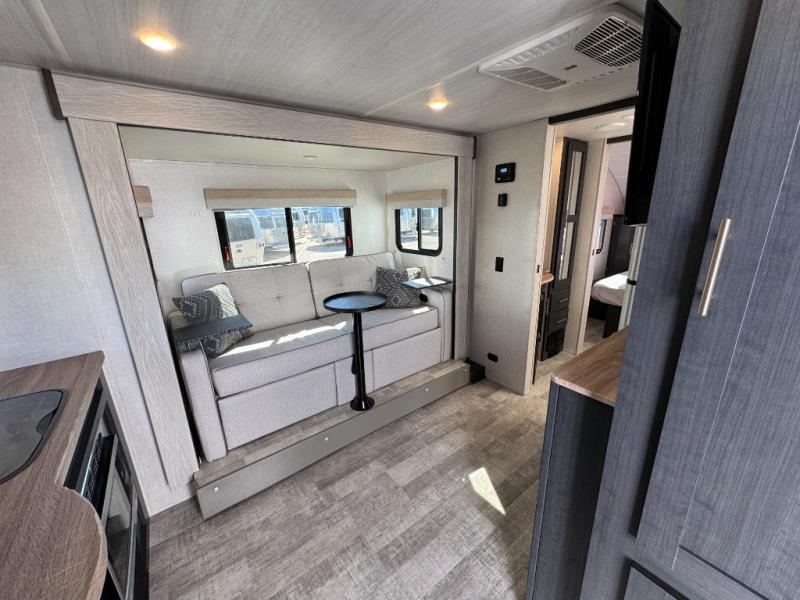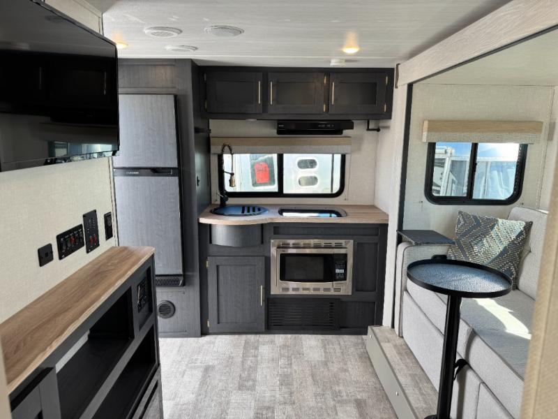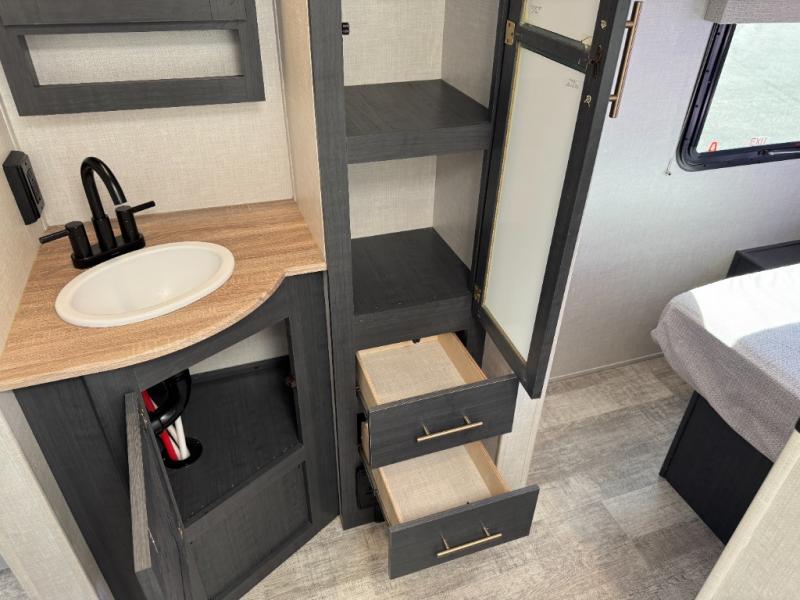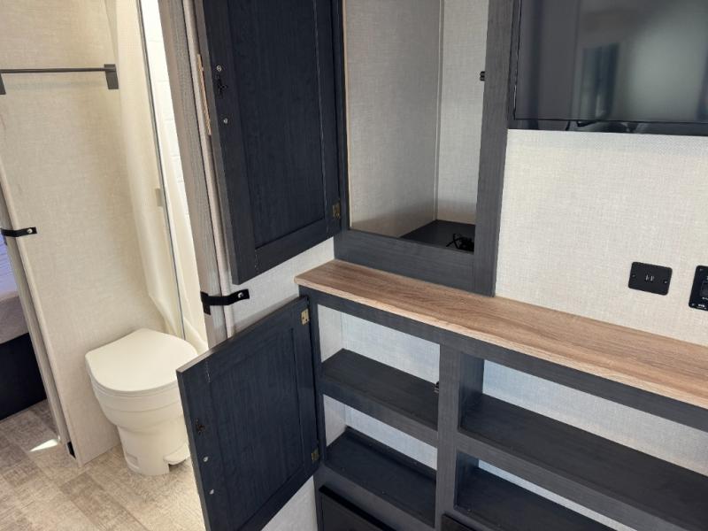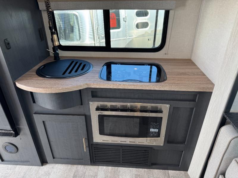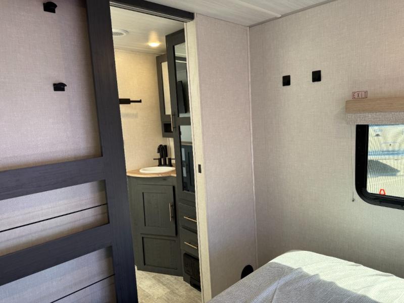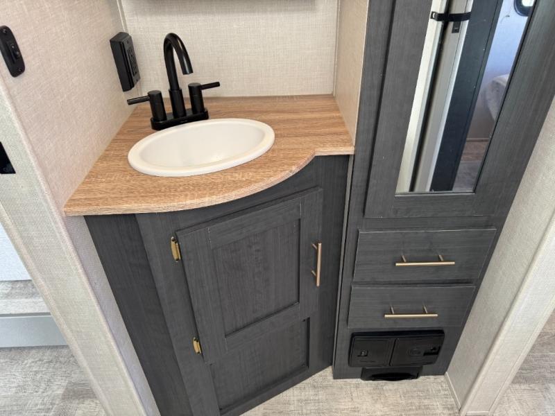 A private bedroom with a walk-around RV queen bed, a walk-through bathroom, and an outside kitchen are a few of the features that you are sure to want in your next RV! You can rest comfortably each night, plus all your clothing can be stored in the dual wardrobes to keep everything tidy. Everyone will stay clean with the full bathroom only steps away, and there is linen storage as well. The main living and kitchen area offers a dinette slide that can also sleep one more camper. The rear kitchen provides everything you will need, plus the outside kitchen with an outdoor griddle and sink gives you more choices. Step inside to start planning your weekend trip!
