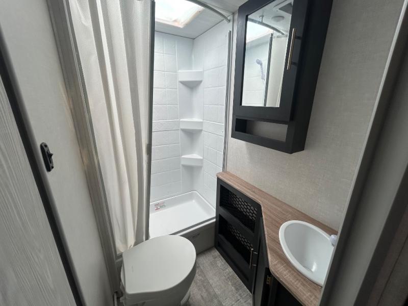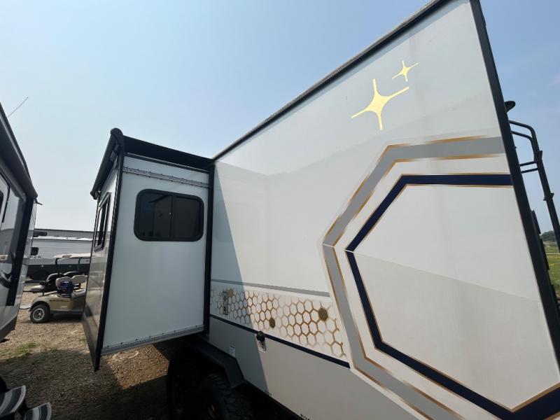 This R-Pod offers a great flexible floorplan. The living area sofa hides a 60" x 74" Murphy bed which can be folded down at night, giving you full use of the room during the day. At the rear is a pair of 44" x 74" double bunks which provide a spacious private sleeping area for children or guests. The dinette booth can also be used for an additional bed as needed. An efficient kitchen an L-shaped counter with stools will make meals easy. And everyone will appreciate the rear corner bath with shower to clean up at the end of a long day!
