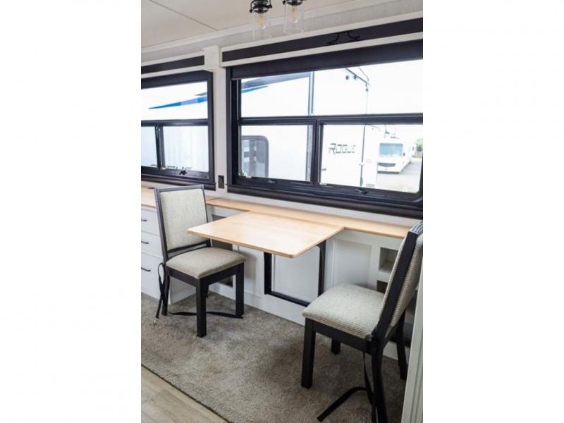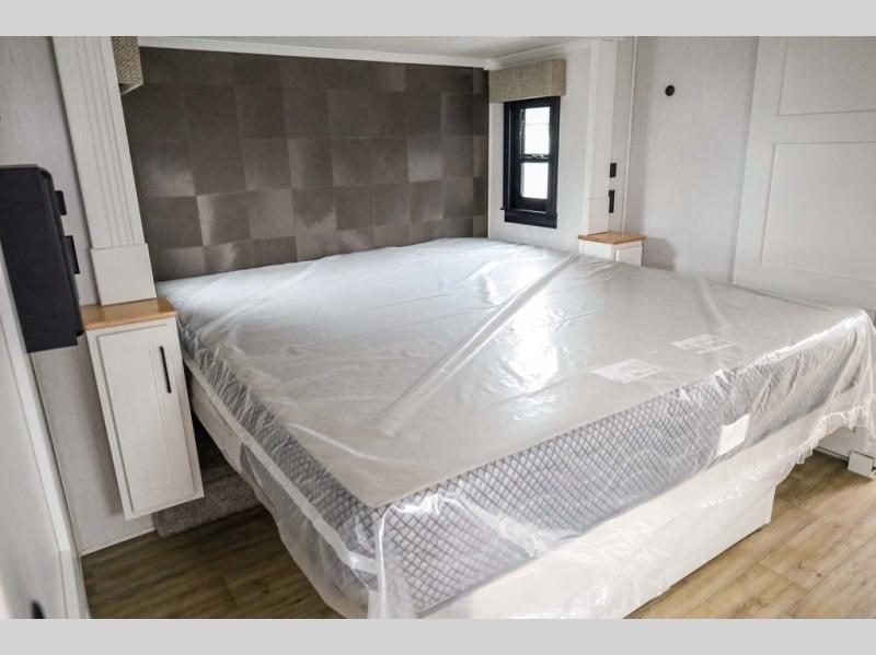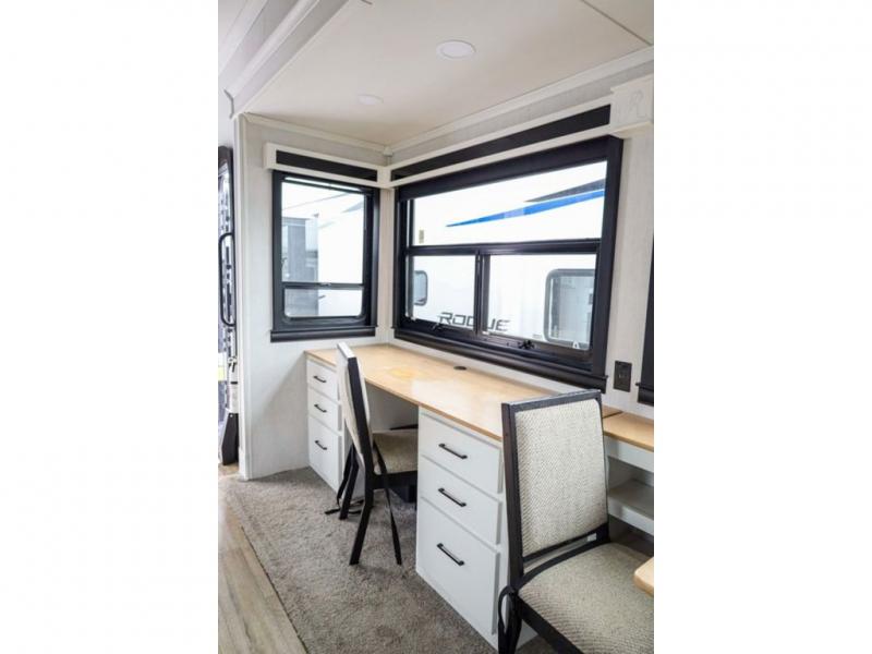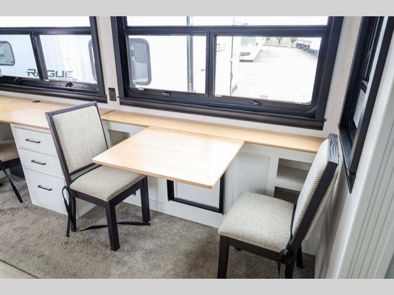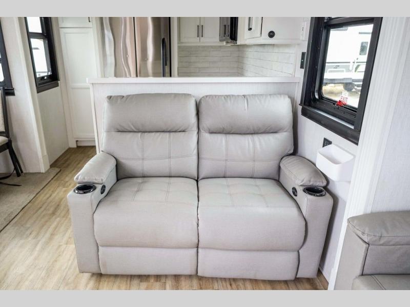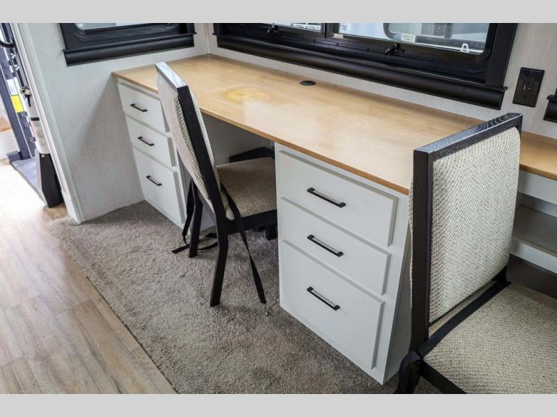 Show your family a good time with this RiverStone fifth wheel! You will get to stay in a super comfortable master suite at the front of this unit which has a dual-sink vanity in the full bathroom. The bedroom offers you a king-size bed that you can rest on while you watch the 40" LED TV across from you, and there is a half bathroom just outside the bedroom for your friends or family to use. If you've decided to bring work with you on the road, you'll be grateful to find a desk in the living area, and the pull-out dinette is a great place to sit down for meals. Work your magic in the kitchen and prepare something delicious on the four-burner range for everyone to eat.