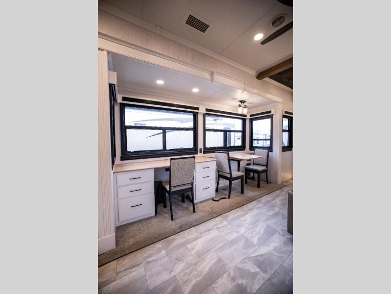 Show your family a good time with this RiverStone fifth wheel! You will get to stay in a super comfortable master suite at the front of this unit which has a dual-sink vanity in the full bathroom. The bedroom offers you a king-size bed that you can rest on while you watch the 40" LED TV across from you, and there is a half bathroom just outside the bedroom for your friends or family to use. If you've decided to bring work with you on the road, you'll be grateful to find a desk in the living area, and the pull-out dinette is a great place to sit down for meals. Work your magic in the kitchen and prepare something delicious on the four-burner range for everyone to eat.