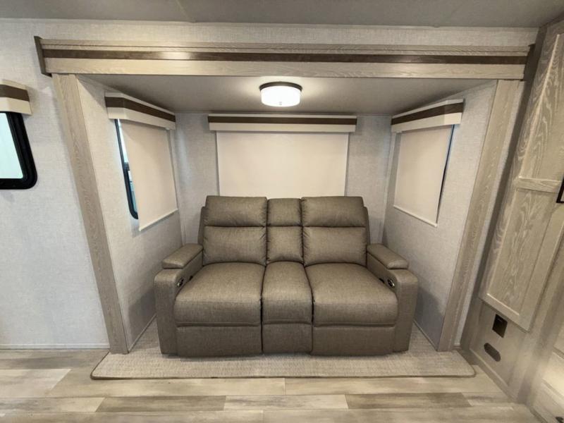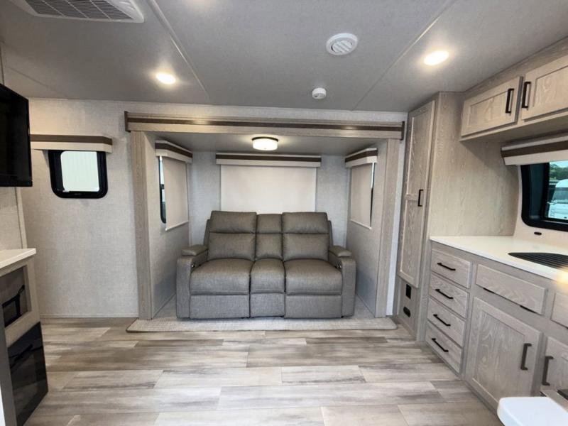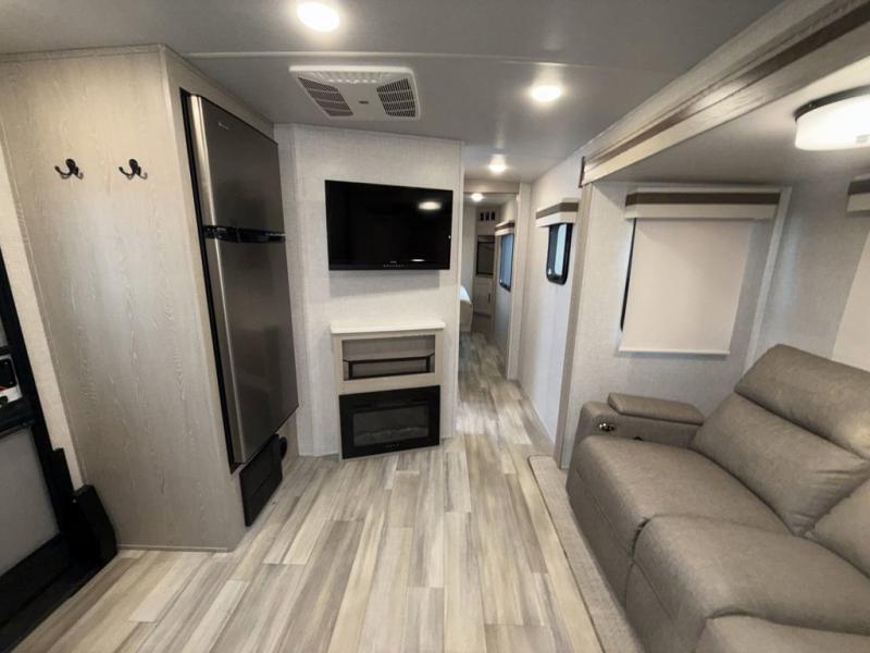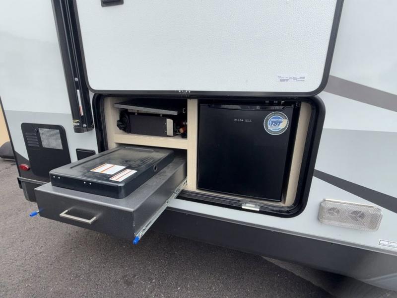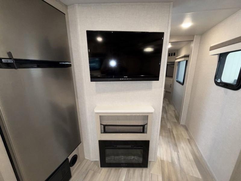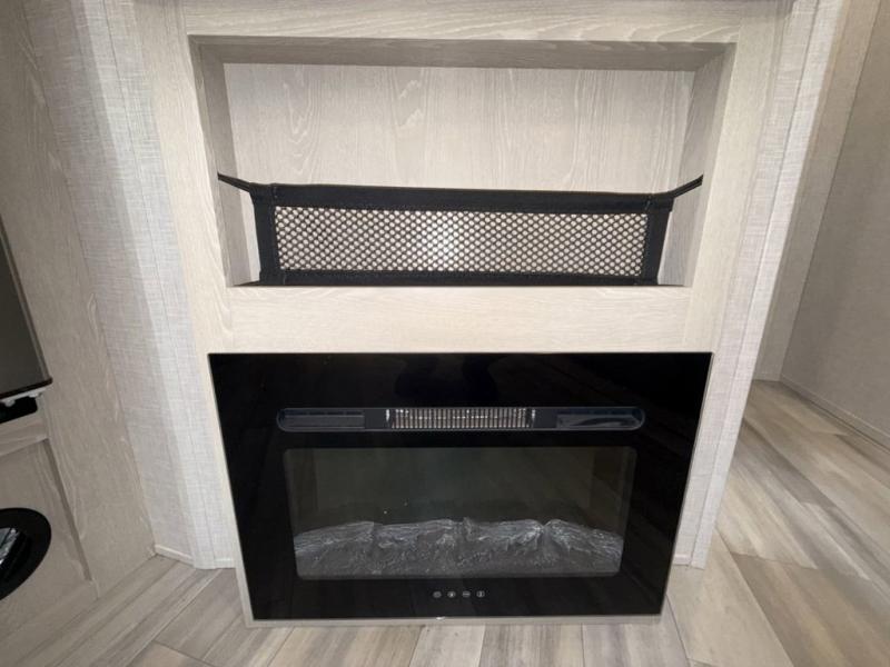 If you like the front kitchen layout, you're going to love this one! You'll have plenty of counter space to prepare and cook meals, or you may just want to head outdoors to cook on the outside kitchen. There is a 17' power awning with LED lights to keep you protected from the sun and rain, and there are three exterior storage compartments for lawn chairs, fishing poles, and firewood! This model includes a U-shaped dinette slide in perfect view of the LED TV and fireplace, and this area can double as your guests' sleeping space at night. You'll stay comfortable in the rear bedroom that includes an RV queen bed, dual bedroom wardrobes, and an optional TV if you enjoy movies in bed!