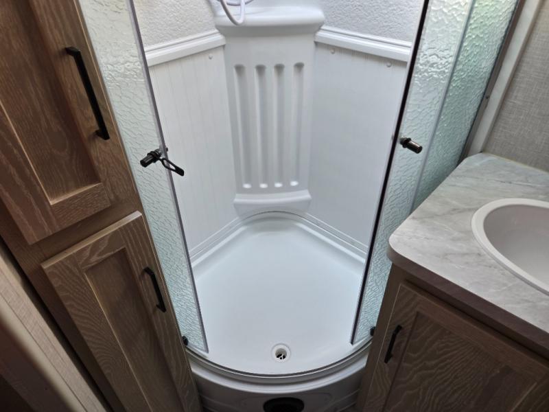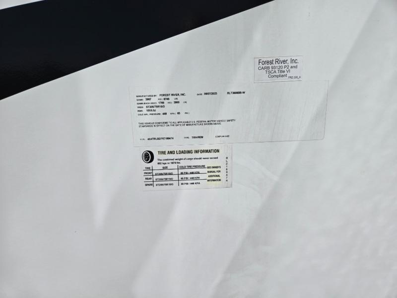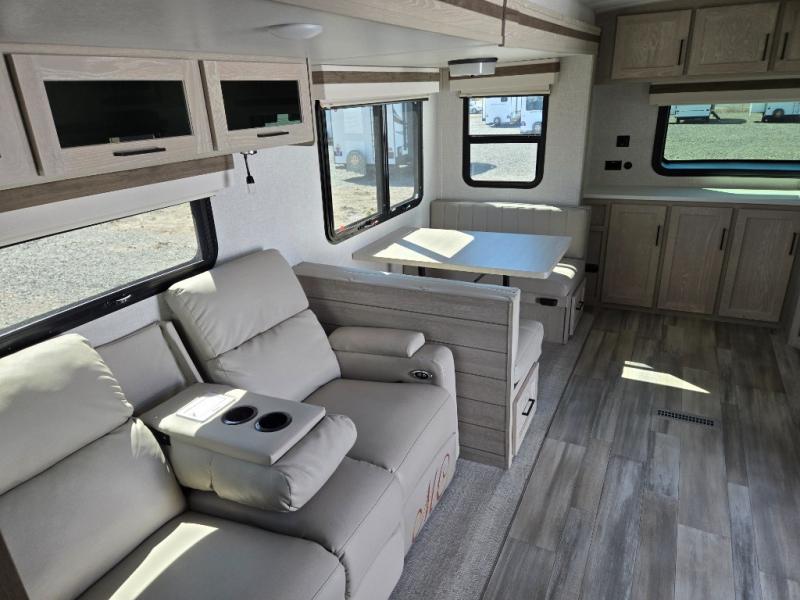 When you are outside this trailer you can enjoy the protection from the 21' power awning, and whip up a meal using the outside griddle. You will find exterior storage for your extra gear, and a ladder on the rear. You get to choose which entrance to step up into, be it the spacious rear bedroom with a queen bed slide and a wardrobe, or the main entry into the kitchen and living area. The furniture slide includes a booth dinette to eat your meals at, and theater seating to watch the LED TV with fireplace below. And the cook will love the front kitchen with extra counter space, and the appliances are nearby to make warm meals, and the pantry is next to the entry allowing you to grab a snack on your way out for a hike.