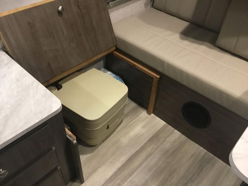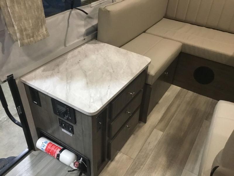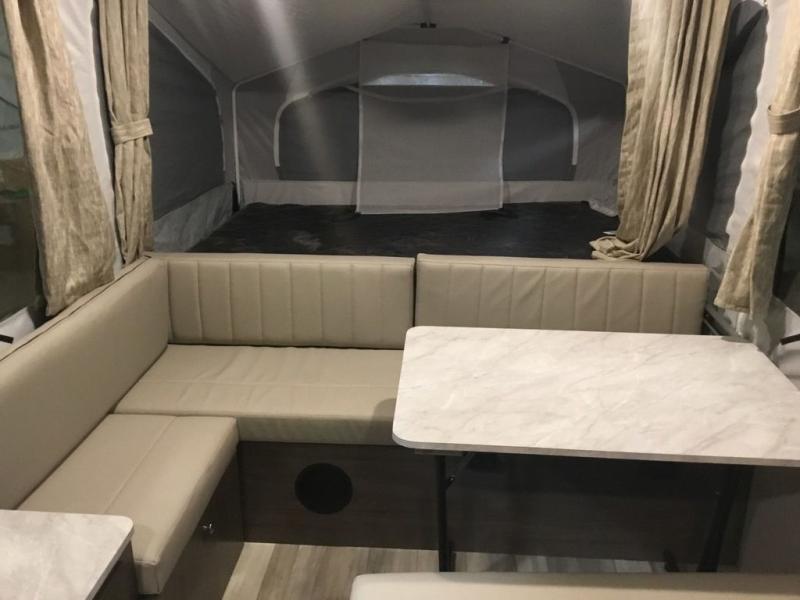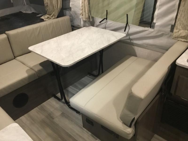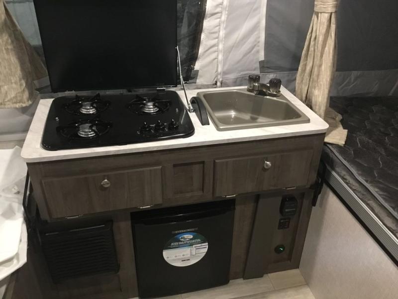 Your family of four to six will love camping in this camper with two tent end beds and an L-shaped dinette with a table extension giving you a place to dine. There is even a Port-a-Pottie for added convenience at night. The cook will have a swing galley with a range and sink to make meals inside as well as an exterior griddle. The interior also offers residential style cabinet doors, full extension metal drawer guides, plus USB charging ports to keep the electronics ready.