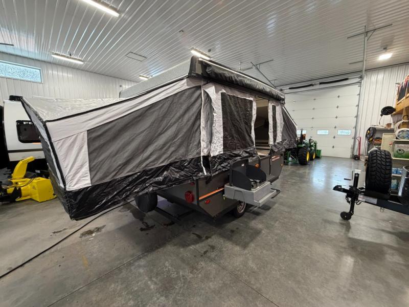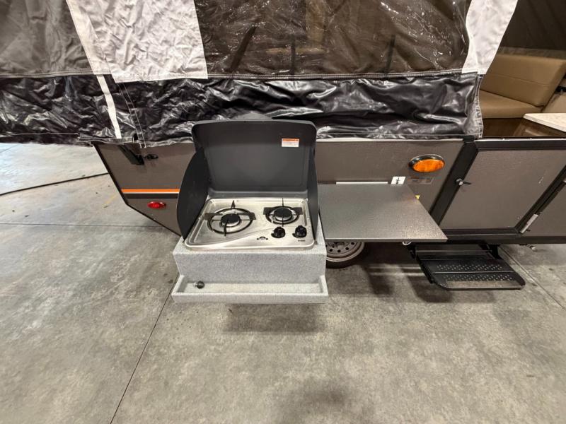 You can make your family trips a special experience by taking them in this folding pop-up camper! With two tent end beds, you'll be able to sleep comfortably each night above ground, and you can also use the booth dinette as an additional sleeping space. The carry out two-burner range is going to give you the ability to create delicious meals, and you can store milk and eggs in the 1.7 cu. ft. 12V refrigerator.