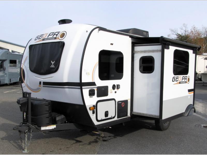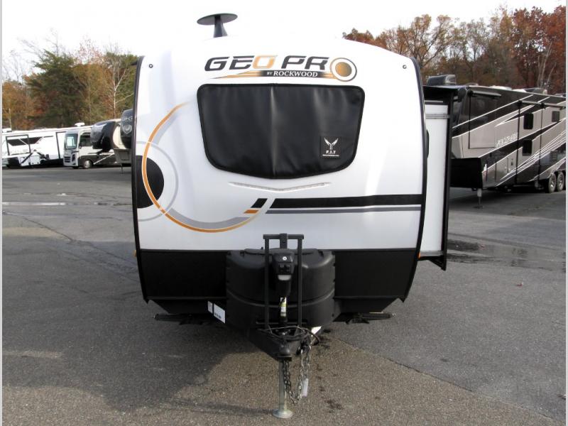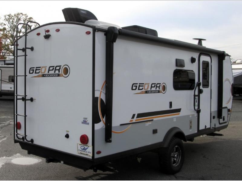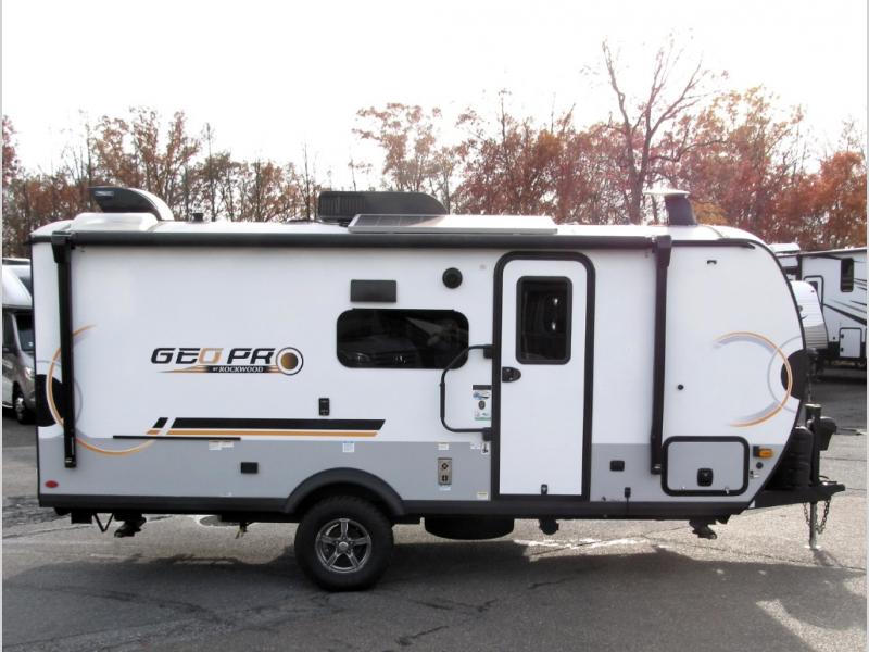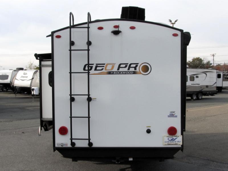 The Rockwood GEO Pro travel trailers and toy hauler by Forest River are ready for all your adventures. The interior and exterior Azdel construction, along with the vacuum laminated roof and walls provide a durable trailer, and the Dexter torsion axles with aluminum wheels make towing easier than ever. There are many convenient amenities, like the 13,500 BTU A/C, the Bluetooth system control panel, and the all-in-one Teton HD TV/WiFi/FM antenna with LTE prep. Each model includes frameless windows, fabric valances and roller shades, and a modern interior that will make you feel right at home. Everything you're looking for in your next RV is in a Rockwood GEO pro by Forest River!