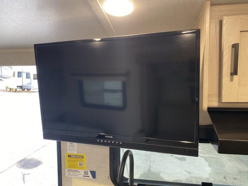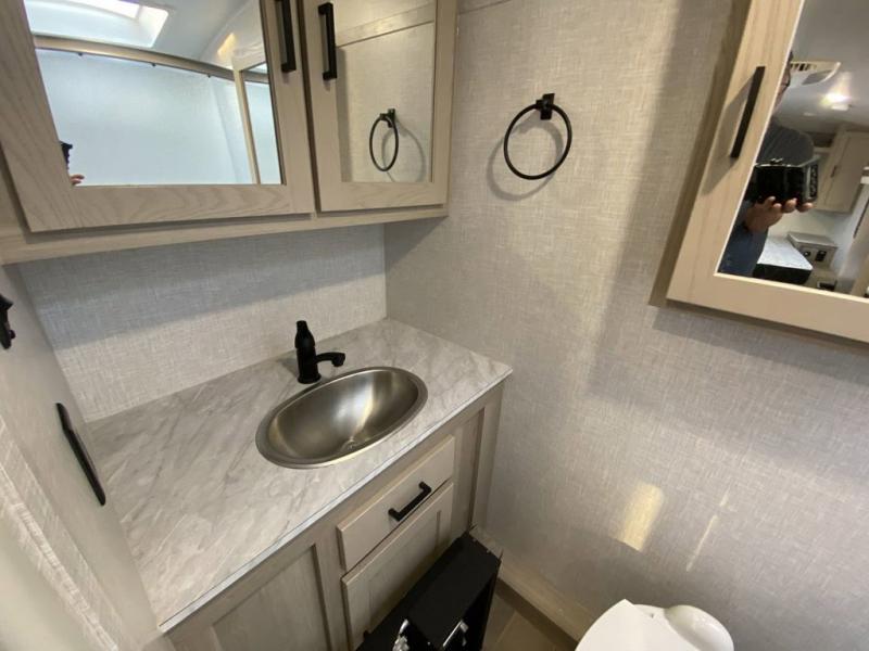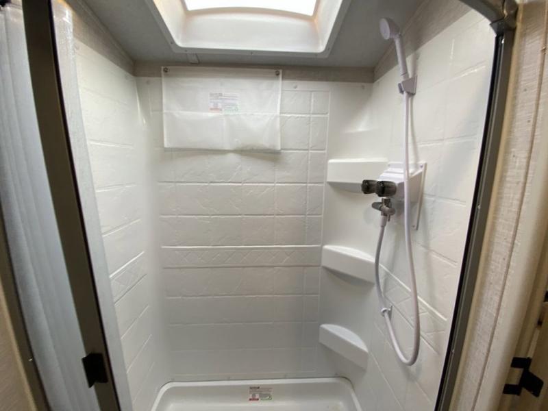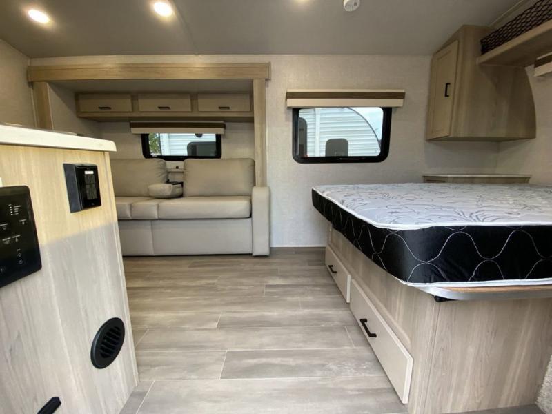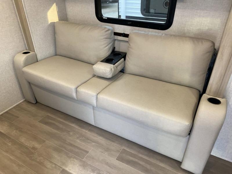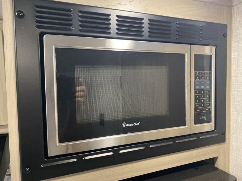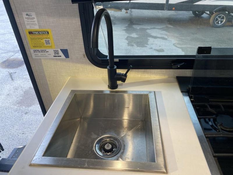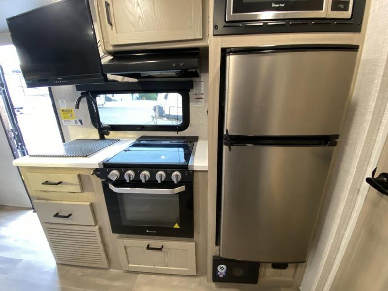 This travel trailer will feel more like home with its front bedroom and walk-around full-size bed. You'll enjoy the 12V TV as you relax on the 72" sofa with a table. The full rear bath includes an oversized shower to clean up in each day and there is a linen closet for clean towels. When you're ready to prepare dinner you'll have a three burner cooktop and microwave oven indoors, and a griddle outdoors! And don't forget the exterior storage allows you to bring along beach toys and tackle boxes!