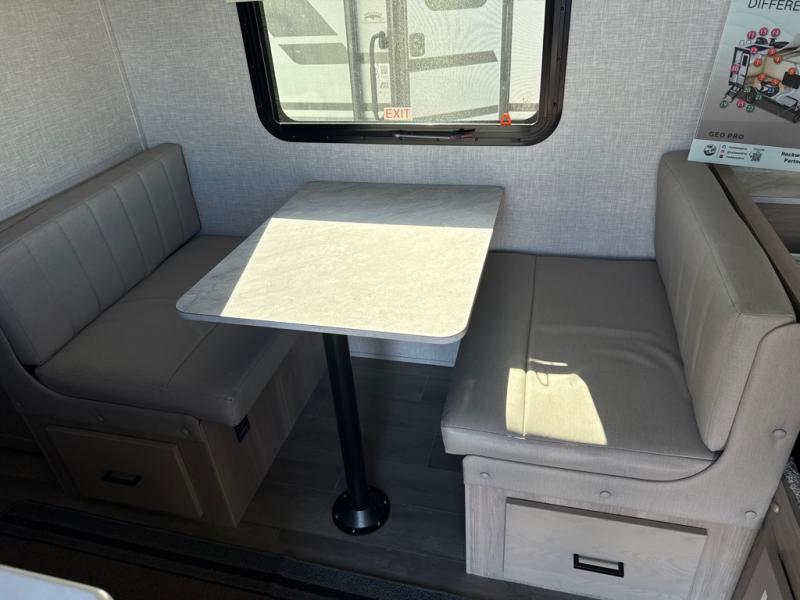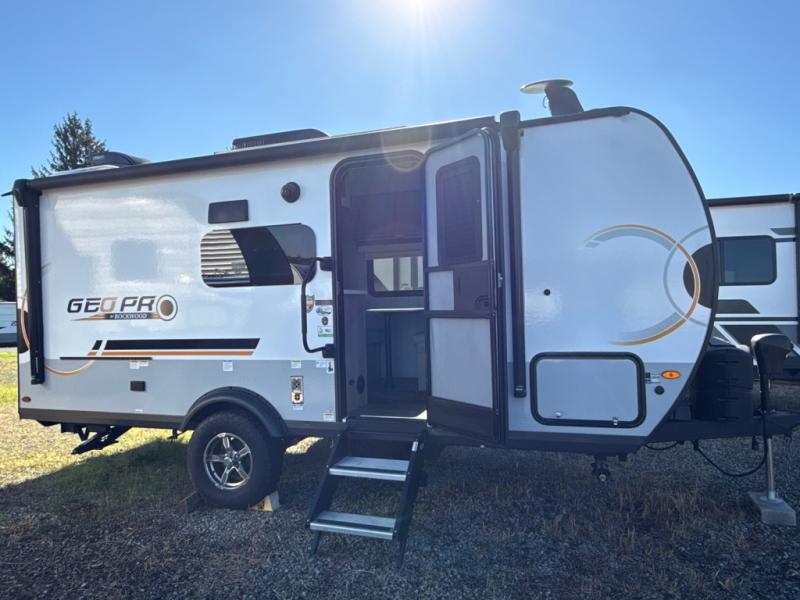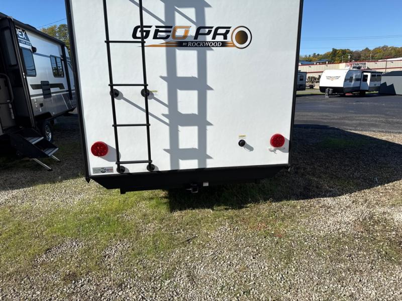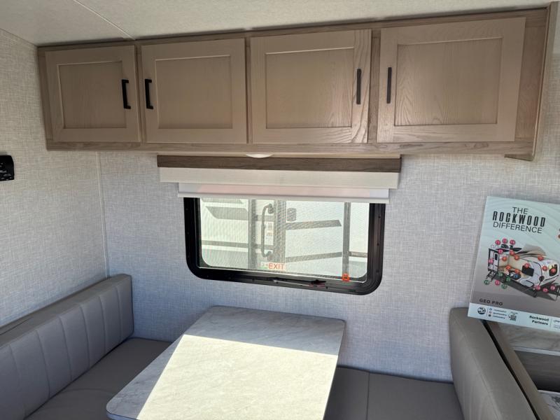 The Rockwood GEO Pro travel trailers and toy hauler by Forest River are ready for all your adventures. The interior and exterior Azdel construction, along with the vacuum laminated roof and walls provide a durable trailer, and the Dexter torsion axles with aluminum wheels make towing easier than ever. There are many convenient amenities, like the 13,500 BTU A/C, the Bluetooth system control panel, and the all-in-one Teton HD TV/WiFi/FM antenna with LTE prep. Each model includes frameless windows, fabric valances and roller shades, and a modern interior that will make you feel right at home. Everything you're looking for in your next RV is in a Rockwood GEO pro by Forest River!