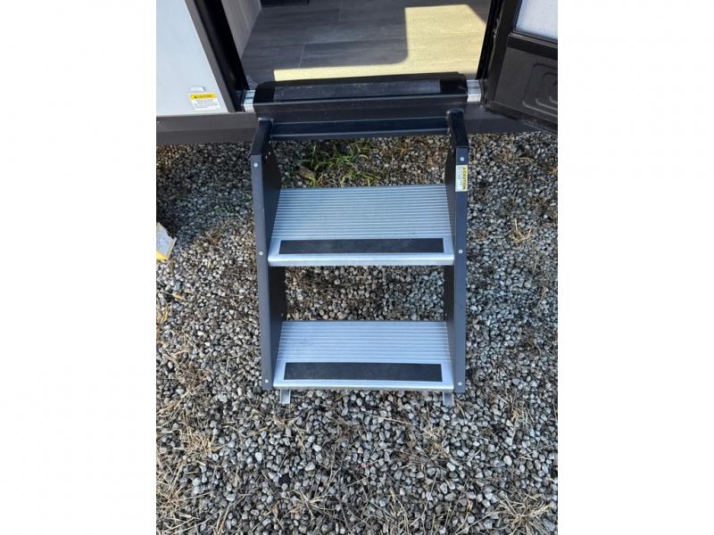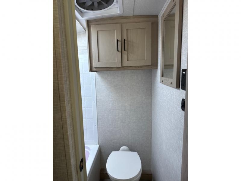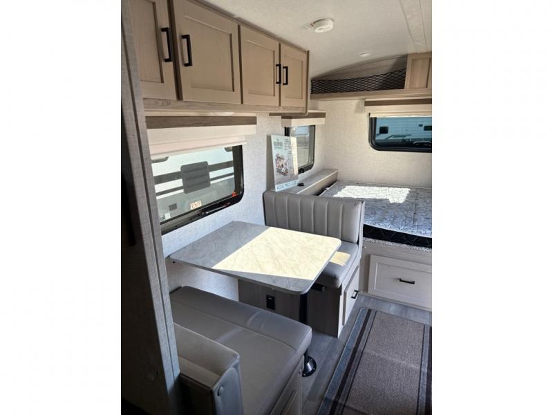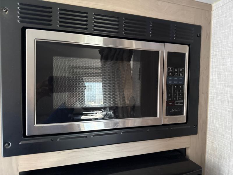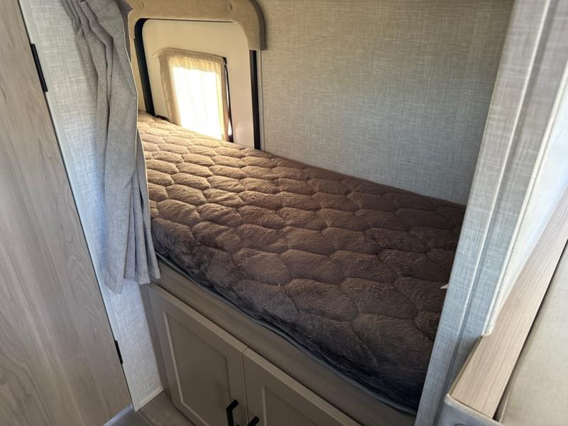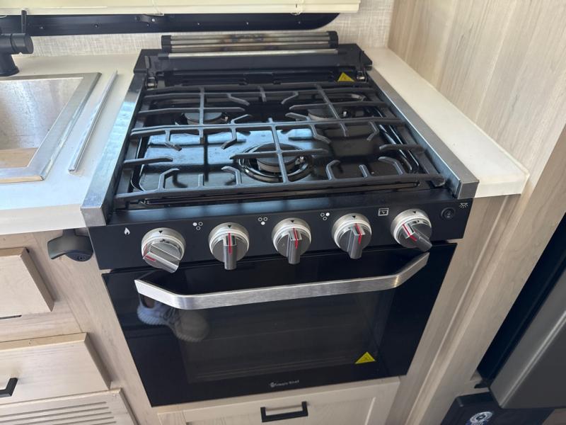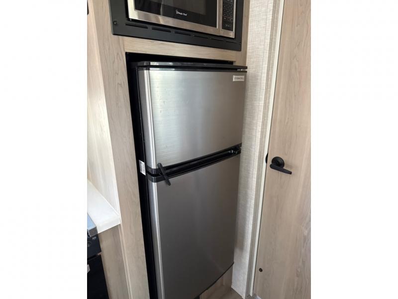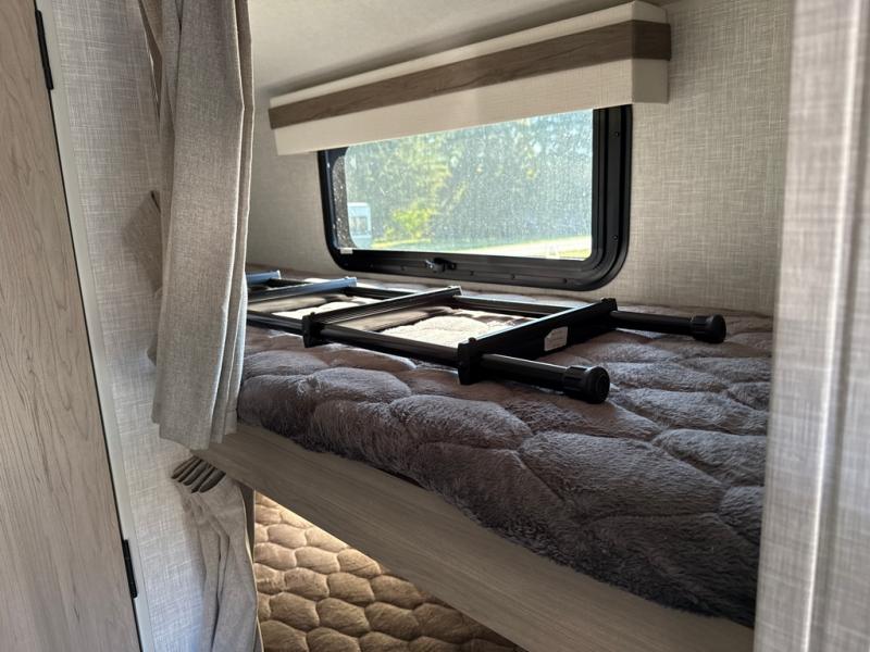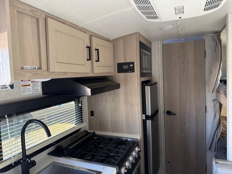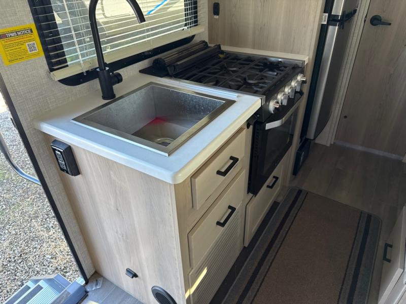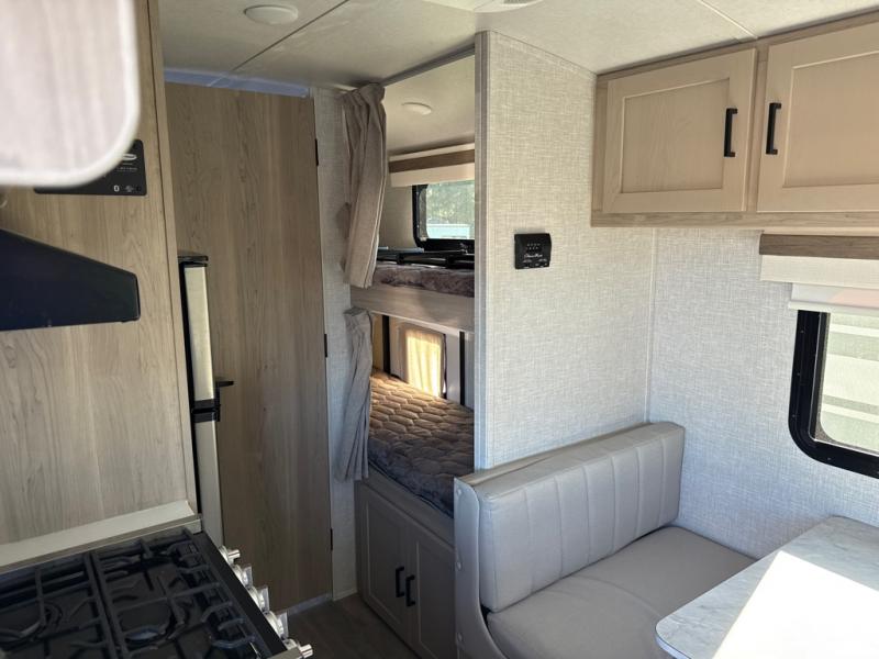 This no slide travel trailer is the perfect lightweight RV for those that love to move around to different campsites. It will be so easy packing up the lawn chairs in the exterior bike door, and there is a rear ladder if you need to clean off the top of your unit. Once you arrive at your destination, put out the 13' power awning, then make lunch on the outside griddle. You will also find a three burner cooktop indoors and a booth dinette where you dine together. This area can be a sleeping space for a small child or adult, plus there is a full-size bed up front and bunk beds in the back.