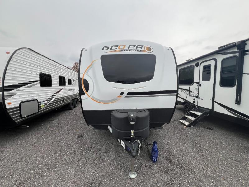 The Rockwood GEO Pro travel trailers and toy hauler by Forest River are ready for all your adventures. The interior and exterior Azdel construction, along with the vacuum laminated roof and walls provide a durable trailer, and the Dexter torsion axles with aluminum wheels make towing easier than ever. There are many convenient amenities, like the 13,500 BTU A/C, the Bluetooth system control panel, and the all-in-one Teton HD TV/WiFi/FM antenna with LTE prep. Each model includes frameless windows, fabric valances and roller shades, and a modern interior that will make you feel right at home. Everything you're looking for in your next RV is in a Rockwood GEO pro by Forest River!