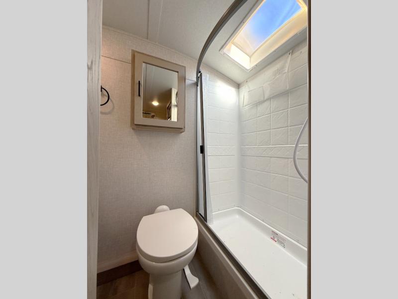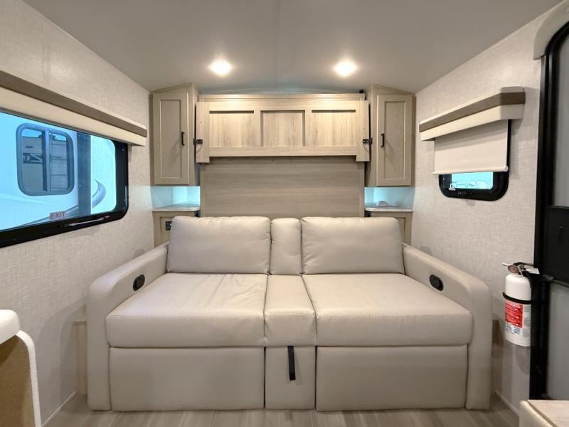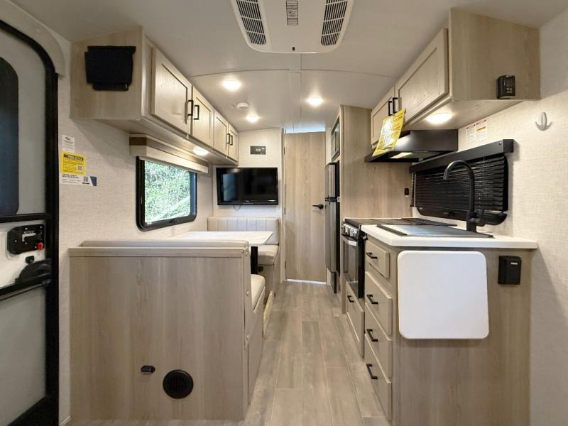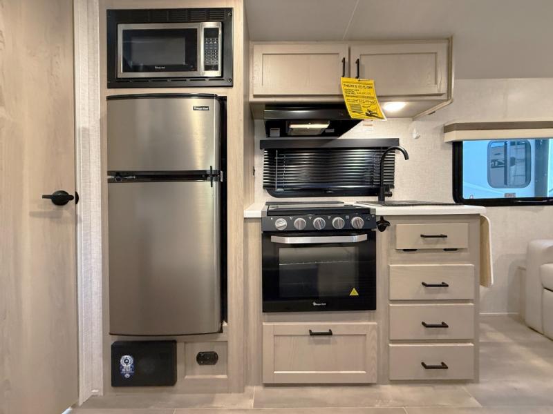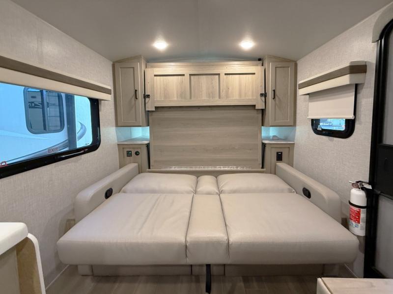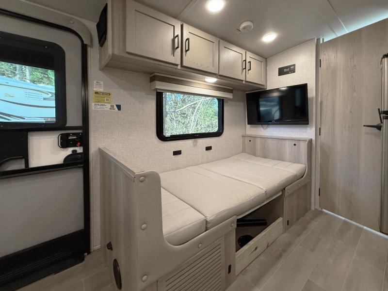 You will love how versatile this travel trailer is thanks to the Murphy bed up front. After you've had a great night's rest, just fold it up to relax on the 72" sofa. This will give the chef more space in the morning to prepare breakfast on the three burner cooktop. There is a 32" booth dinette to dine at, or you may just want to take your plate outdoors under the 13' power awning. The full rear bath includes a large linen closet to store clean towels and there is a Showermiser Water Saver you are sure to appreciate. This model also includes a pass-through storage, plus additional exterior storage so you can bring along hiking gear, water tubes, and fishing poles!