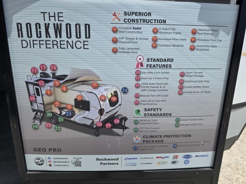 The Rockwood GEO Pro travel trailers and toy hauler by Forest River are ready for all your adventures. The interior and exterior Azdel construction, along with the vacuum laminated roof and walls provide a durable trailer, and the Dexter torsion axles with aluminum wheels make towing easier than ever. There are many convenient amenities, like the 13,500 BTU A/C, the Bluetooth system control panel, and the all-in-one Teton HD TV/WiFi/FM antenna with LTE prep. Each model includes frameless windows, fabric valances and roller shades, and a modern interior that will make you feel right at home. Everything you're looking for in your next RV is in a Rockwood GEO pro by Forest River!