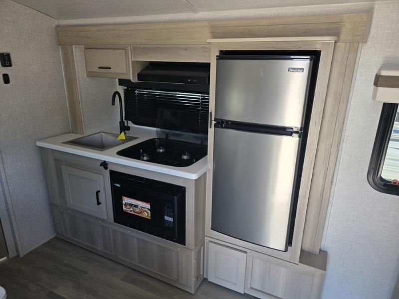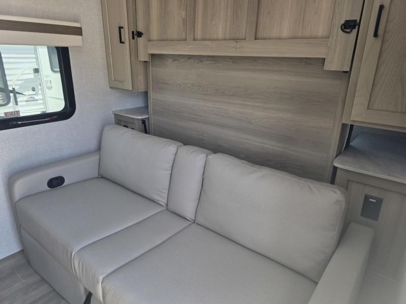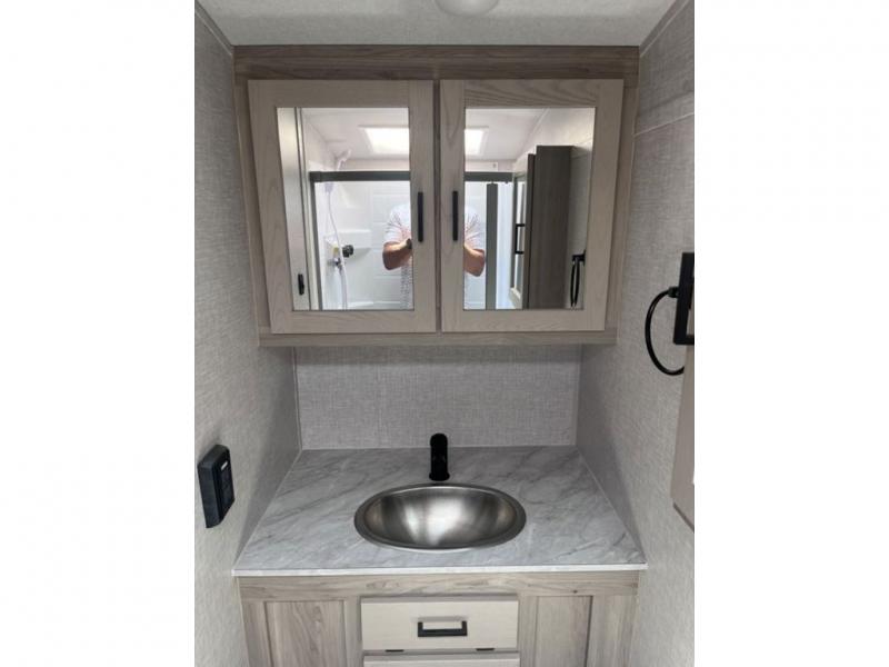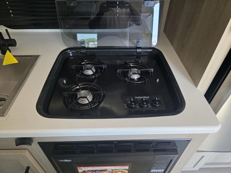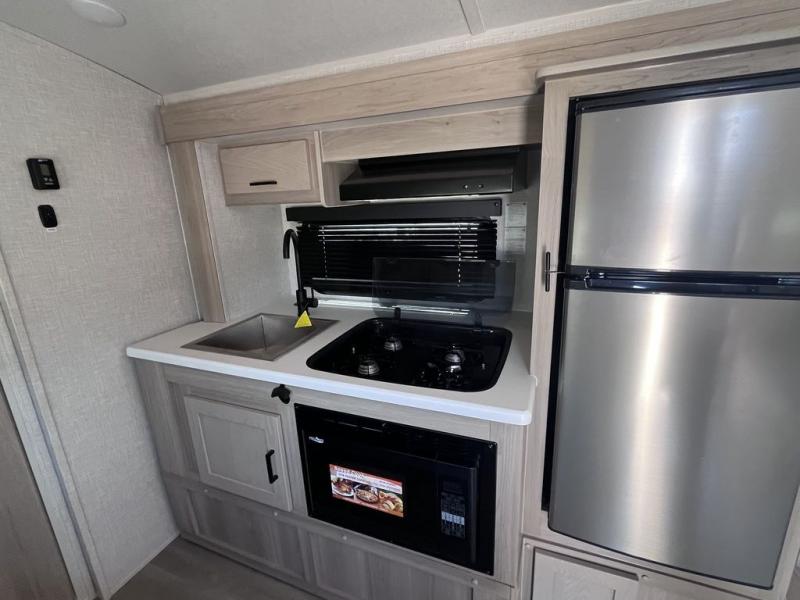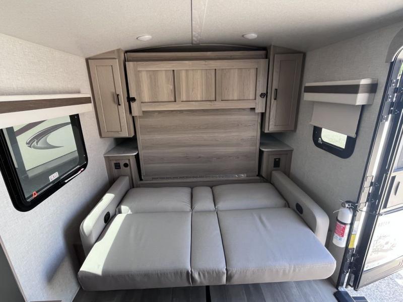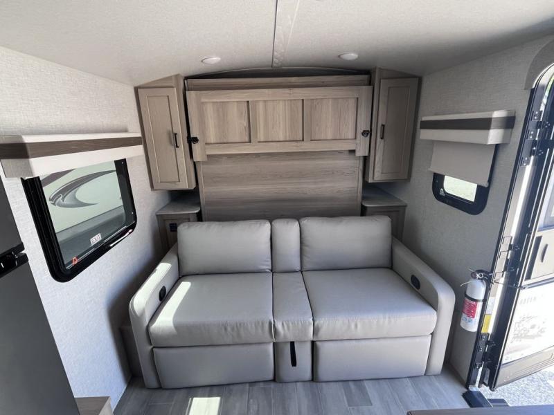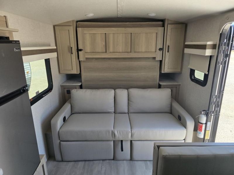 Comfortable sleeping space, convenient seating space, and a full rear bath makes this couple's trailer the one! You will love being able to relax on the sofa during the day, and sleep on the Murphy bed at night. There is a single slide out that will provide you more space to move around or cook meals, and the full bath includes a large shower so you won't feel cramped. If it's a rainy day you can watch movies on the 12V TV, and if it's nice out, sit under the 14' power awning and cook lunch on the outside griddle. The possibilities are endless with this couple's trailer!