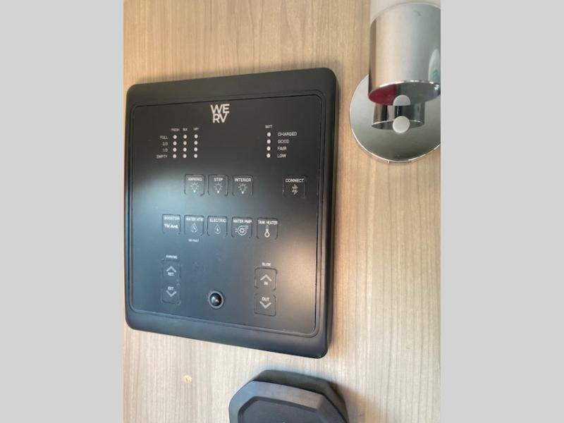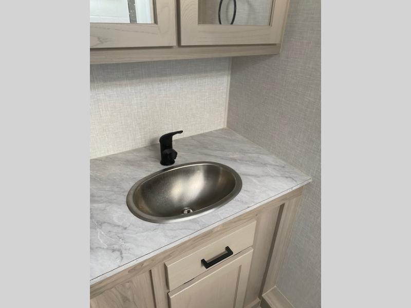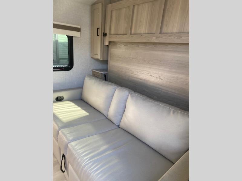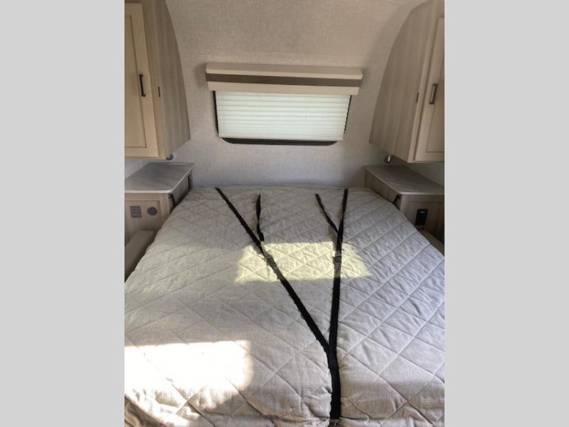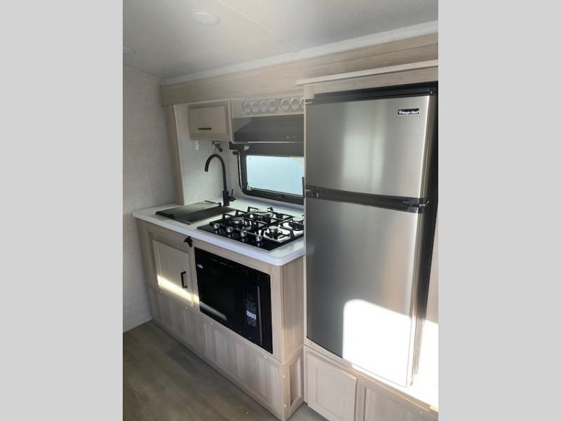 Comfortable sleeping space, convenient seating space, and a full rear bath makes this couple's trailer the one! You will love being able to relax on the sofa during the day, and sleep on the Murphy bed at night. There is a single slide out that will provide you more space to move around or cook meals, and the full bath includes a large shower so you won't feel cramped. If it's a rainy day you can watch movies on the 12V TV, and if it's nice out, sit under the 14' power awning and cook lunch on the outside griddle. The possibilities are endless with this couple's trailer!