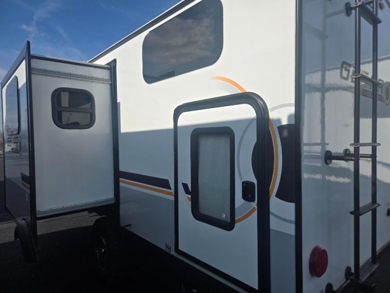 Your going to love camping with your family or friends in this largest bunk model in the GEO Pro lineup. The bunk beds will be perfect for little ones, while you take the front full-size bed. There is also a 44" booth dinette within the slide out for additional sleeping and seating space. The kitchen includes everything the chef will need to prepare meals each day, including a three burner cooktop, a microwave oven, and a 12V refrigerator for perishables. If the weather is nice, you may just find the chef outdoors cooking on the outside griddle under the 14' power awning. And check out the exterior bike door that will be perfect for bikes, luggage, or extra camp gear!
