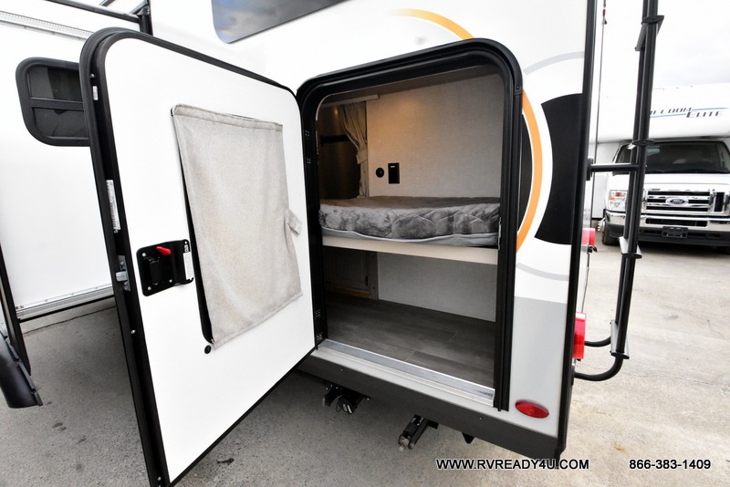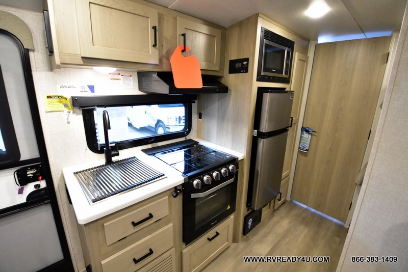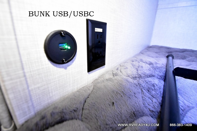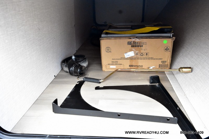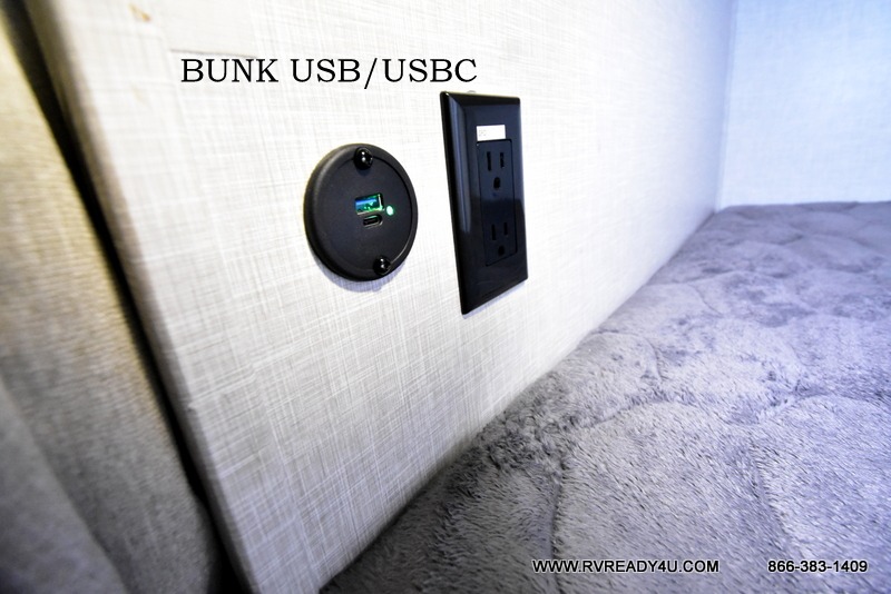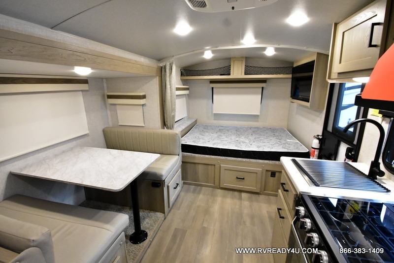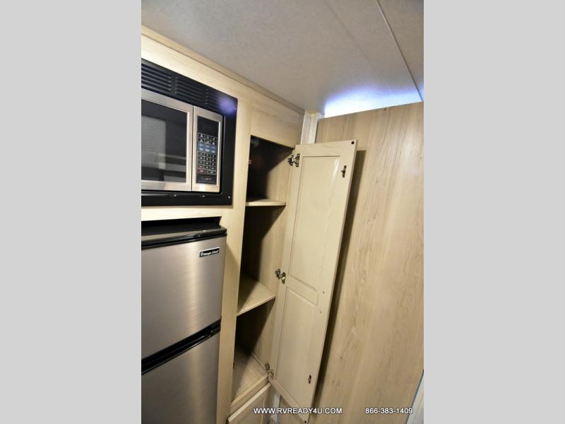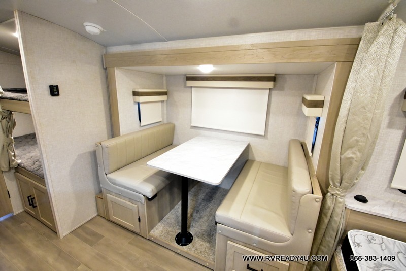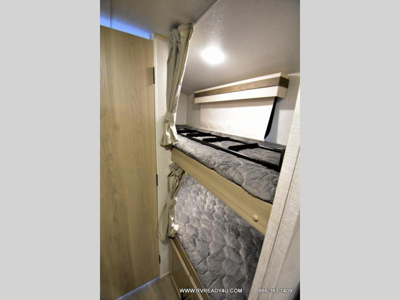 Your going to love camping with your family or friends in this largest bunk model in the GEO Pro lineup. The bunk beds will be perfect for little ones, while you take the front full-size bed. There is also a 44" booth dinette within the slide out for additional sleeping and seating space. The kitchen includes everything the chef will need to prepare meals each day, including a three burner cooktop, a microwave oven, and a 12V refrigerator for perishables. If the weather is nice, you may just find the chef outdoors cooking on the outside griddle under the 14' power awning. And check out the exterior bike door that will be perfect for bikes, luggage, or extra camp gear!