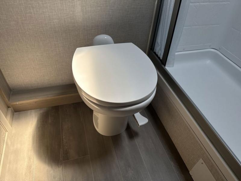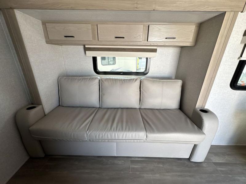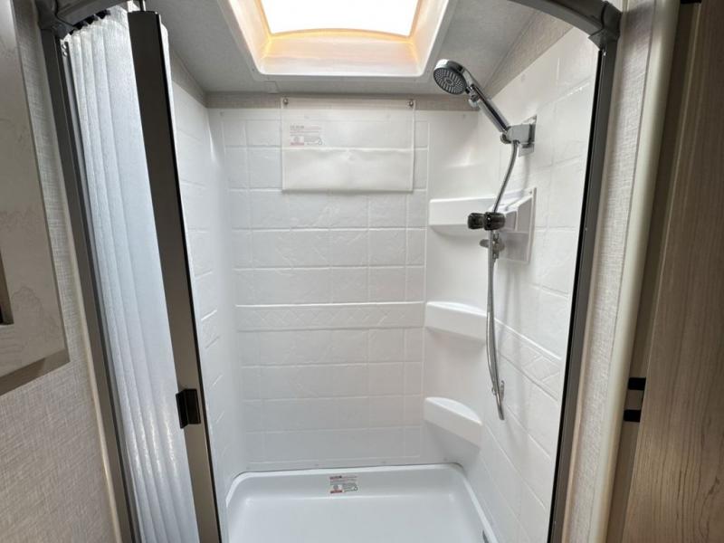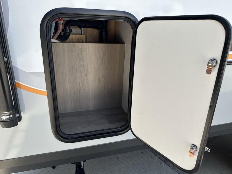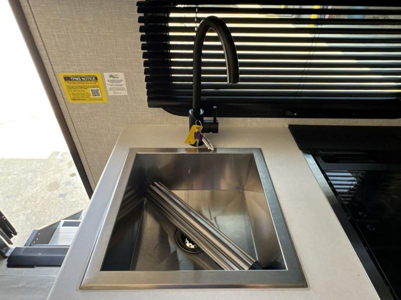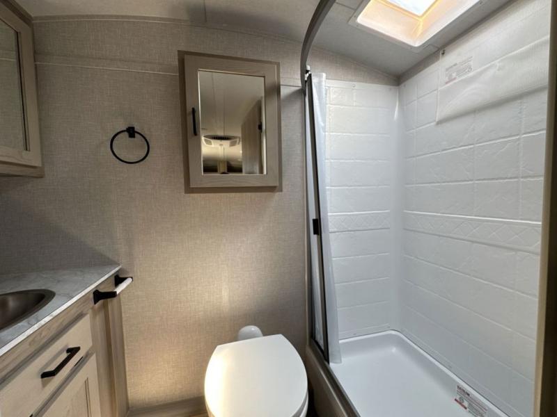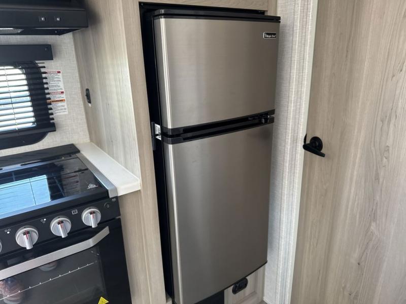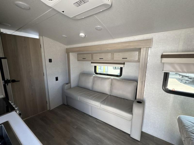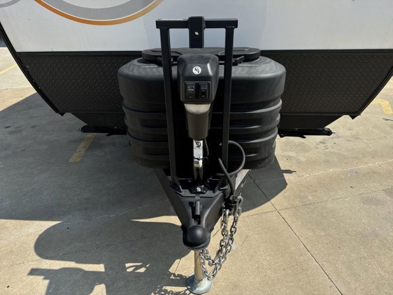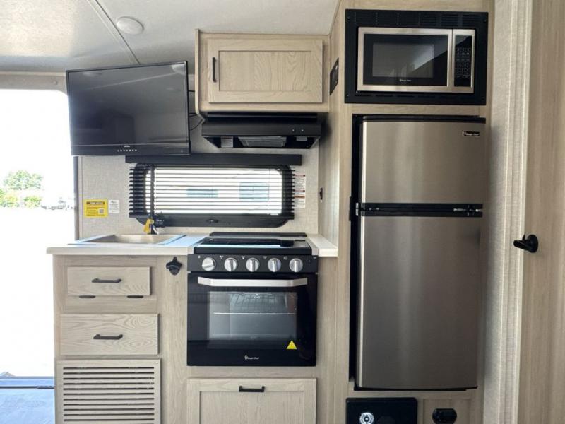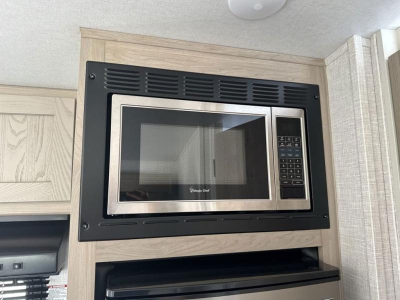 This travel trailer will feel more like home with its front bedroom and walk-around full-size bed. You'll enjoy the 12V TV as you relax on the 72" sofa with a table. The full rear bath includes an oversized shower to clean up in each day and there is a linen closet for clean towels. When you're ready to prepare dinner you'll have a three burner cooktop and microwave oven indoors, and a griddle outdoors! And don't forget the exterior storage allows you to bring along beach toys and tackle boxes!