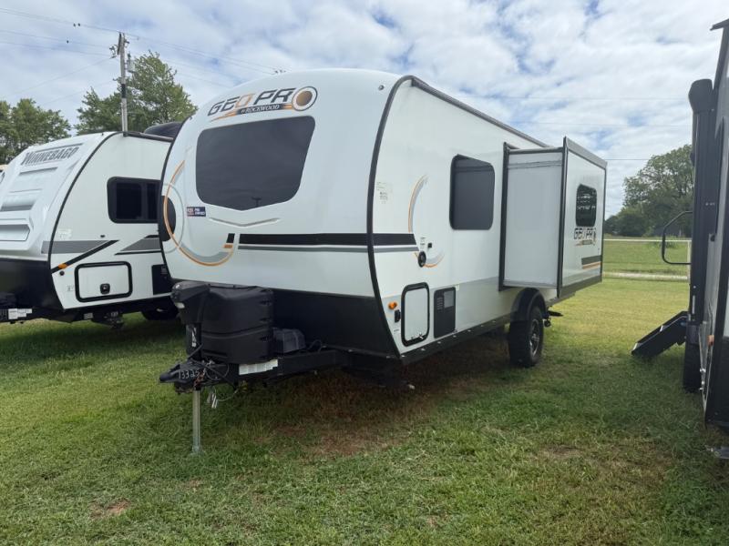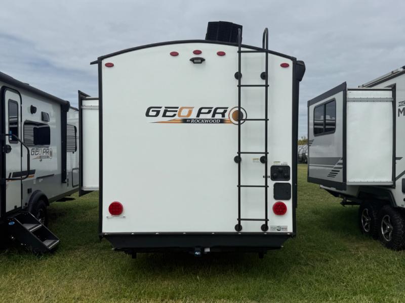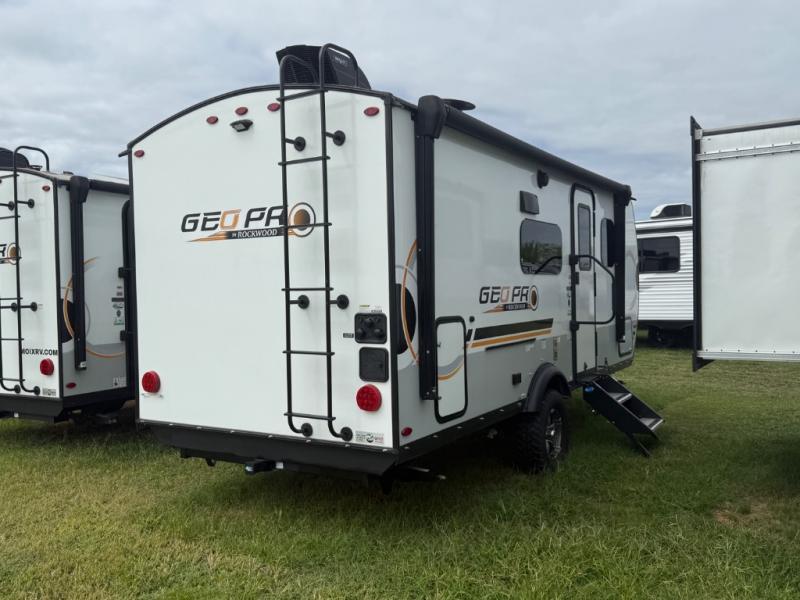 The Rockwood GEO Pro travel trailers and toy hauler by Forest River are ready for all your adventures. The interior and exterior Azdel construction, along with the vacuum laminated roof and walls provide a durable trailer, and the Dexter torsion axles with aluminum wheels make towing easier than ever. There are many convenient amenities, like the 13,500 BTU A/C, the Bluetooth system control panel, and the all-in-one Teton HD TV/WiFi/FM antenna with LTE prep. Each model includes frameless windows, fabric valances and roller shades, and a modern interior that will make you feel right at home. Everything you're looking for in your next RV is in a Rockwood GEO pro by Forest River!