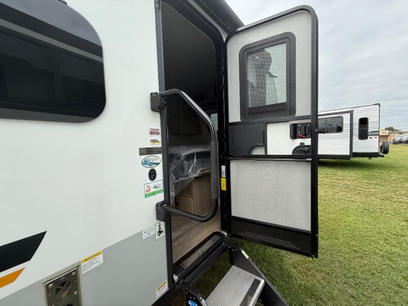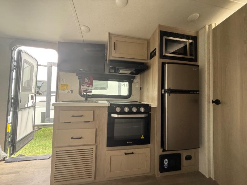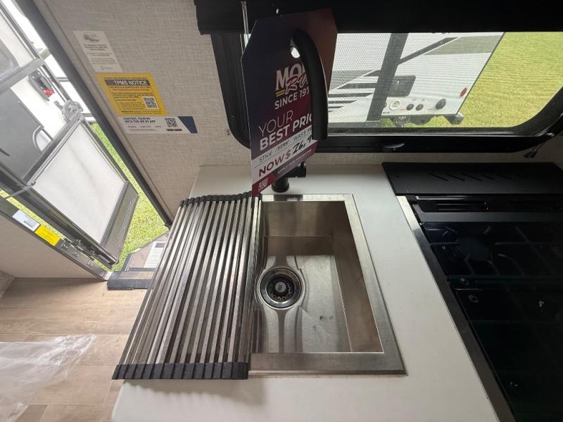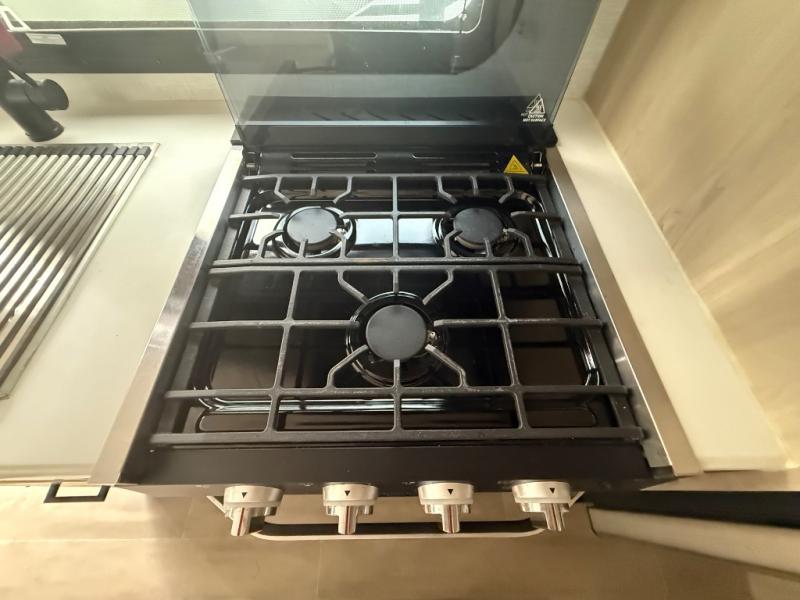 This travel trailer will feel more like home with its front bedroom and walk-around full-size bed. You'll enjoy the 12V TV as you relax on the 72" sofa with a table. The full rear bath includes an oversized shower to clean up in each day and there is a linen closet for clean towels. When you're ready to prepare dinner you'll have a three burner cooktop and microwave oven indoors, and a griddle outdoors! And don't forget the exterior storage allows you to bring along beach toys and tackle boxes!
