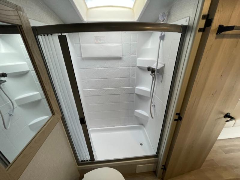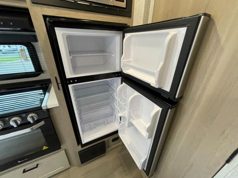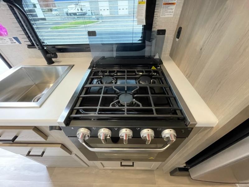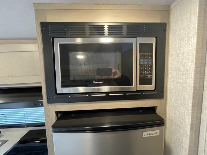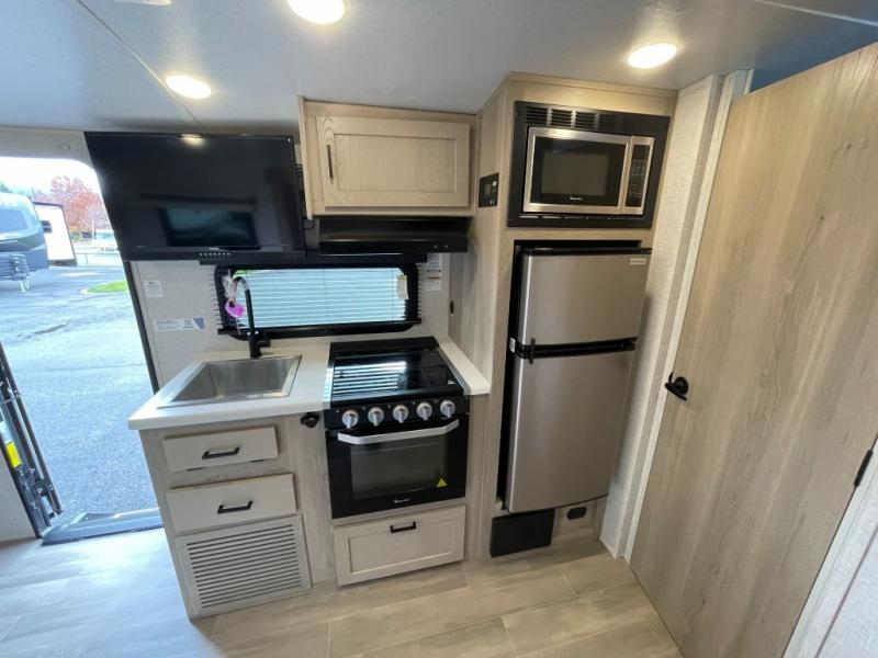 This travel trailer will feel more like home with its front bedroom and walk-around full-size bed. You'll enjoy the 12V TV as you relax on the 72" sofa with a table. The full rear bath includes an oversized shower to clean up in each day and there is a linen closet for clean towels. When you're ready to prepare dinner you'll have a three burner cooktop and microwave oven indoors, and a griddle outdoors! And don't forget the exterior storage allows you to bring along beach toys and tackle boxes!