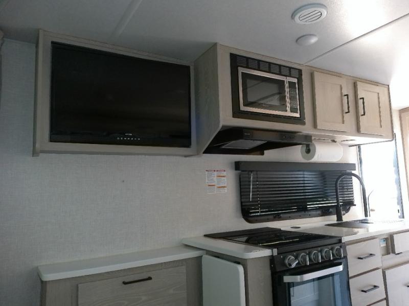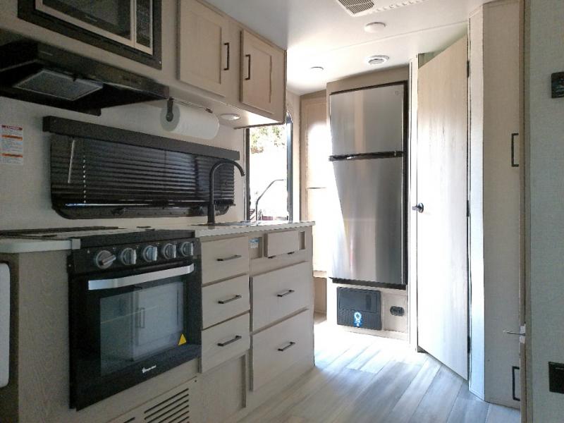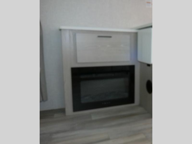 Enjoy camping season with your spouse, friend, or significant other in this cozy travel trailer for two. Each morning, you can have your coffee on the theater seats with a table within the slide out, then head outdoors to make pancakes on the outdoor griddle with an LP hookup. The interior kitchen includes a three burner cooktop, a microwave oven, plus a 12 volt refrigerator for perishables. An entertainment center with a fireplace will make your space feel more like home, and what's better than sleeping on your own queen bed with dual bedroom wardrobes for your clothes!?